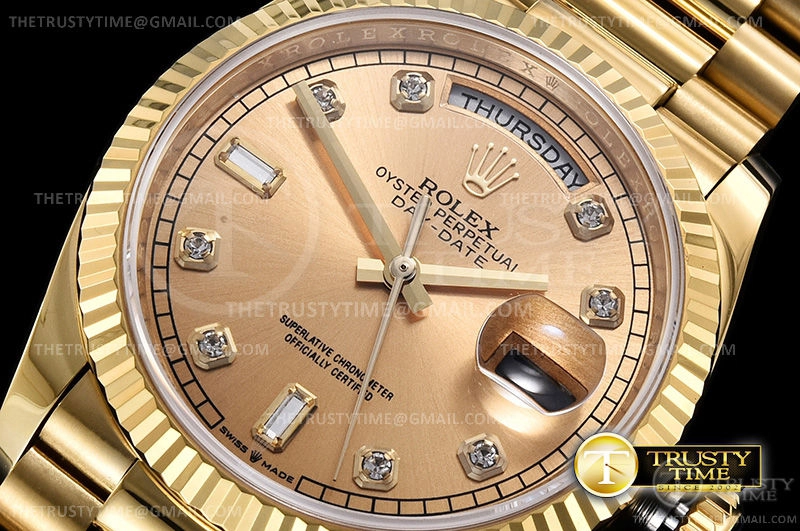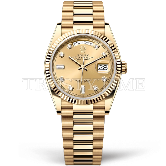 Часы Rolex из коллекции Day-Date. Классические женские часы Rolex Day-Date 36mm 128238-0008 премиального качества (Артикул магазина: RX-0902) оснащены надежным автоматическим механизмом с автоподзаводом (работает от амплитуды движения руки) калибра 3255, в котором реализованы следующие функции: часовая, минутная и секундная стрелки, а так же дата, день недели. Круглый корпус часов цветы желтой золота, имеющий размер 36 мм и высоту 12 мм превосходно дополнит образ и украсит запястье своего обладателя. Для изготовления часов Rolex Day-Date 36mm 128238-0008 предлагаемых в нашем интернет-магазине, применяются нержавеющая сталь 904 высокого качества (Швейцарский стандарт), а так же сапфировое стекло высокой прочности, благодаря чему обеспечивается максимальная защита от сколов и механических повреждений. Отличительной чертой данной модели является золотой циферблат, часовые индексы которого обеспечивают камни. Завершает образ браслет из нержавеющей стали цвета желтого золота с фирменной раскладывающейся застежкой Rolex. Водонепроницаемость данной модели составляет 30М (WR30) – допускается минимальное воздействие с водой.