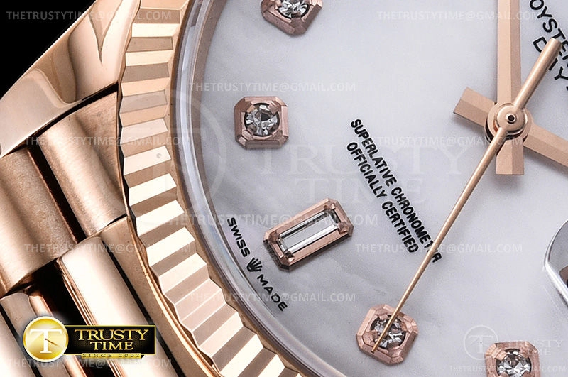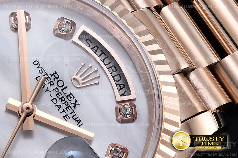Часы Rolex из коллекции Day-Date. Классические женские часы Rolex Day-Date 36mm 128235-0029 премиального качества (Артикул магазина: RX-0905) оснащены надежным автоматическим механизмом с автоподзаводом (работает от амплитуды движения руки) калибра 3255, в котором реализованы следующие функции: часовая, минутная и секундная стрелки, а так же дата, день недели. Круглый корпус часов розового цвета, имеющий размер 36 мм и высоту 12 мм превосходно дополнит образ и украсит запястье своего обладателя. Для изготовления часов Rolex Day-Date 36mm 128235-0029 предлагаемых в нашем интернет-магазине, применяются нержавеющая сталь 904 высокого качества (Швейцарский стандарт), а так же сапфировое стекло высокой прочности, благодаря чему обеспечивается максимальная защита от сколов и механических повреждений. Отличительной чертой данной модели является перламутровый циферблат, часовые индексы которого обеспечивают камни. Завершает образ браслет из нержавеющей стали цвета розового золота с фирменной раскладывающейся застежкой Rolex. Водонепроницаемость данной модели составляет 30М (WR30) – допускается минимальное воздействие с водой.