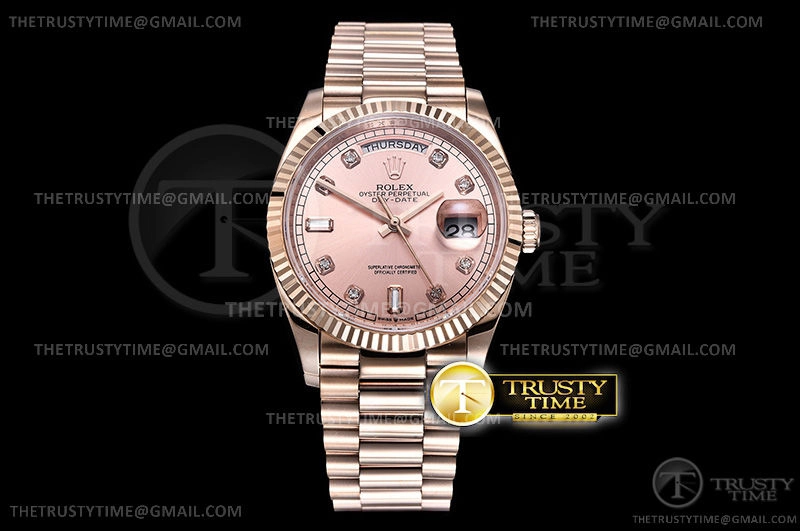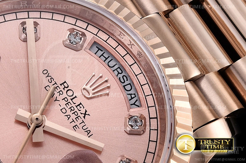 Часы Rolex из коллекции Day-Date. Классические женские часы Rolex Day-Date 36mm 128235-0009 премиального качества (Артикул магазина: RX-0908) оснащены надежным автоматическим механизмом с автоподзаводом (работает от амплитуды движения руки) калибра 3255, в котором реализованы следующие функции: часовая, минутная и секундная стрелки, а так же дата, день недели. Круглый корпус часов розового цвета, имеющий размер 36 мм и высоту 12 мм превосходно дополнит образ и украсит запястье своего обладателя. Для изготовления часов Rolex Day-Date 36mm 128235-0009 предлагаемых в нашем интернет-магазине, применяются нержавеющая сталь 904 высокого качества (Швейцарский стандарт), а так же сапфировое стекло высокой прочности, благодаря чему обеспечивается максимальная защита от сколов и механических повреждений. Отличительной чертой данной модели является золотой циферблат, часовые индексы которого обеспечивают камни. Завершает образ браслет из нержавеющей стали цвета розового золота с фирменной раскладывающейся застежкой Rolex. Водонепроницаемость данной модели составляет 30М (WR30) – допускается минимальное воздействие с водой.