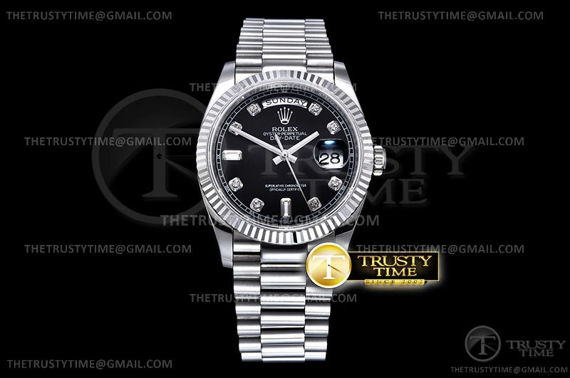 Часы Rolex из коллекции Day-Date. Классические женские часы Rolex Day-Date 36mm 118239-0089 премиального качества (Артикул магазина: RX-0892) оснащены надежным автоматическим механизмом с автоподзаводом (работает от амплитуды движения руки) калибра 3255, в котором реализованы следующие функции: часовая, минутная и секундная стрелки, а так же дата, день недели. Круглый корпус часов стального цвета, имеющий размер 36 мм и высоту 12 мм превосходно дополнит образ и украсит запястье своего обладателя. Для изготовления часов Rolex Day-Date 36mm 118239-0089 предлагаемых в нашем интернет-магазине, применяются нержавеющая сталь 904 высокого качества (Швейцарский стандарт), а так же сапфировое стекло высокой прочности, благодаря чему обеспечивается максимальная защита от сколов и механических повреждений. Отличительной чертой данной модели является черный циферблат, часовые индексы которого обеспечивают камни. Завершает образ браслет из нержавеющей стали стального цвета с фирменной раскладывающейся застежкой Rolex. Водонепроницаемость данной модели составляет 30М (WR30) – допускается минимальное воздействие с водой.