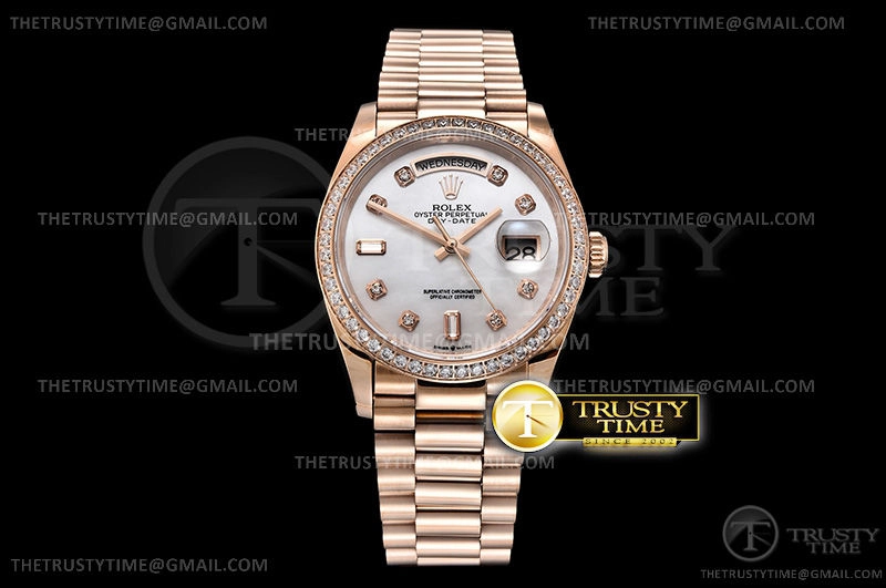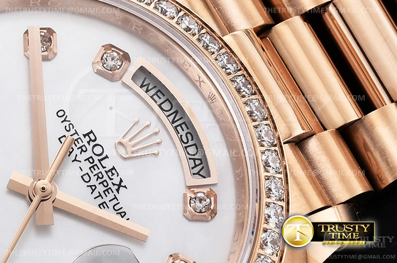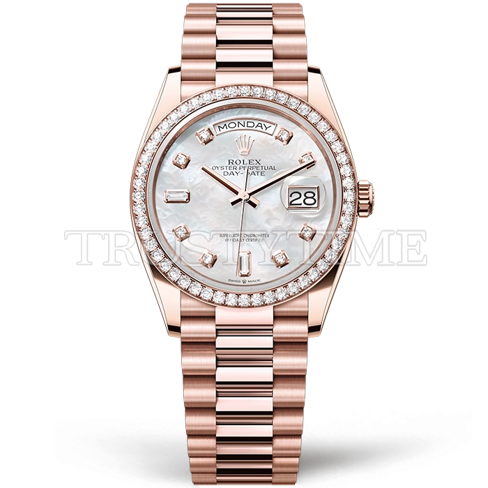 Часы Rolex из коллекции Day-Date. Классические женские часы Rolex Day-Date 36mm 128345RBR-0028 премиального качества (Артикул магазина: RX-1050) оснащены надежным автоматическим механизмом с автоподзаводом (работает от амплитуды движения руки) калибра 3255, в котором реализованы следующие функции: часовая, минутная и секундная стрелки, а так же дата, день недели. Круглый корпус часов розового цвета, имеющий размер 36 мм и высоту 12 мм превосходно дополнит образ и украсит запястье своего обладателя. Для изготовления часов Rolex Day-Date 36mm 128345RBR-0028 предлагаемых в нашем интернет-магазине, применяются нержавеющая сталь 904 высокого качества (Швейцарский стандарт), а так же сапфировое стекло высокой прочности, благодаря чему обеспечивается максимальная защита от сколов и механических повреждений. Отличительной чертой данной модели является перламутровый циферблат, часовые индексы которого обеспечивают камни. Завершает образ браслет из нержавеющей стали цвета розового золота с фирменной раскладывающейся застежкой Rolex. Водонепроницаемость данной модели составляет 30М (WR30) – допускается минимальное воздействие с водой.