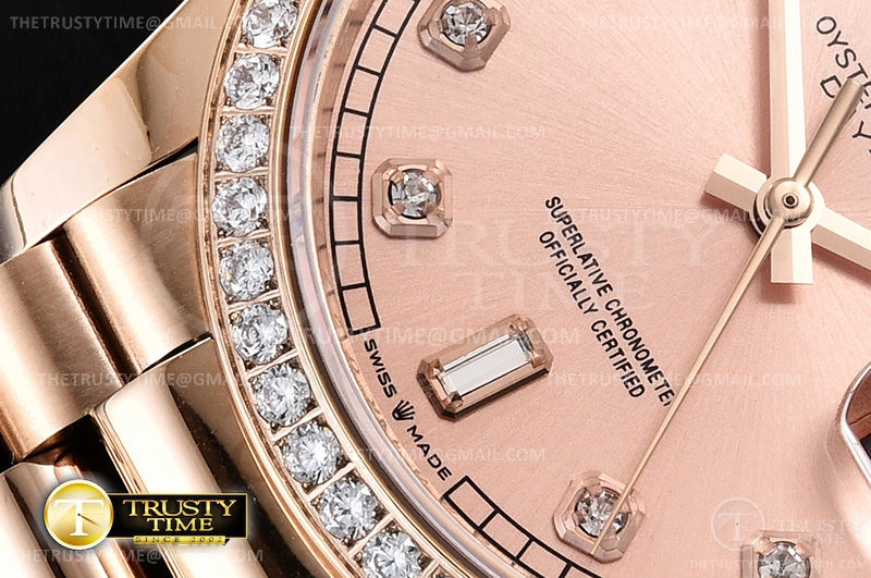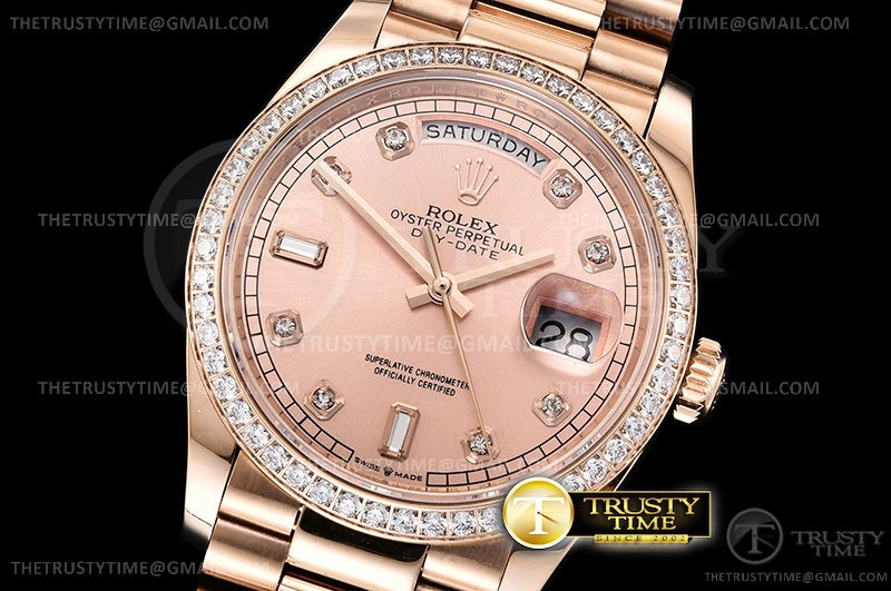 Часы Rolex из коллекции Day-Date. Классические женские часы Rolex Day-Date 36mm 128345RBR-0009 премиального качества (Артикул магазина: RX-1048) оснащены надежным автоматическим механизмом с автоподзаводом (работает от амплитуды движения руки) калибра 3255, в котором реализованы следующие функции: часовая, минутная и секундная стрелки, а так же дата, день недели. Круглый корпус часов розового цвета, имеющий размер 36 мм и высоту 12 мм превосходно дополнит образ и украсит запястье своего обладателя. Для изготовления часов Rolex Day-Date 36mm 128345RBR-0009 предлагаемых в нашем интернет-магазине, применяются нержавеющая сталь 904 высокого качества (Швейцарский стандарт), а так же сапфировое стекло высокой прочности, благодаря чему обеспечивается максимальная защита от сколов и механических повреждений. Отличительной чертой данной модели является золотой циферблат, часовые индексы которого обеспечивают камни. Завершает образ браслет из нержавеющей стали цвета розового золота с фирменной раскладывающейся застежкой Rolex. Водонепроницаемость данной модели составляет 30М (WR30) – допускается минимальное воздействие с водой.