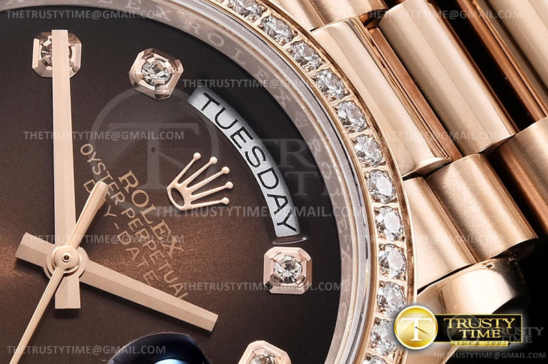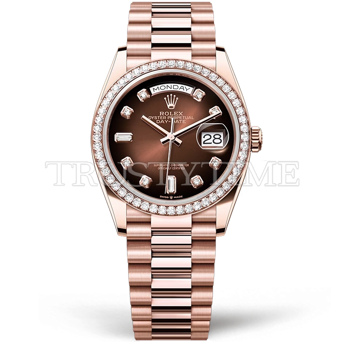 Часы Rolex из коллекции Day-Date. Классические женские часы Rolex Day-Date 36mm 128345RBR-0040 премиального качества (Артикул магазина: RX-1047) оснащены надежным автоматическим механизмом с автоподзаводом (работает от амплитуды движения руки) калибра 3255, в котором реализованы следующие функции: часовая, минутная и секундная стрелки, а так же дата, день недели. Круглый корпус часов розового цвета, имеющий размер 36 мм и высоту 12 мм превосходно дополнит образ и украсит запястье своего обладателя. Для изготовления часов Rolex Day-Date 36mm 128345RBR-0040 предлагаемых в нашем интернет-магазине, применяются нержавеющая сталь 904 высокого качества (Швейцарский стандарт), а так же сапфировое стекло высокой прочности, благодаря чему обеспечивается максимальная защита от сколов и механических повреждений. Отличительной чертой данной модели является коричневый циферблат, часовые индексы которого обеспечивают камни. Завершает образ браслет из нержавеющей стали цвета розового золота с фирменной раскладывающейся застежкой Rolex. Водонепроницаемость данной модели составляет 30М (WR30) – допускается минимальное воздействие с водой.