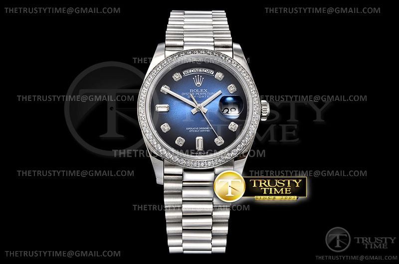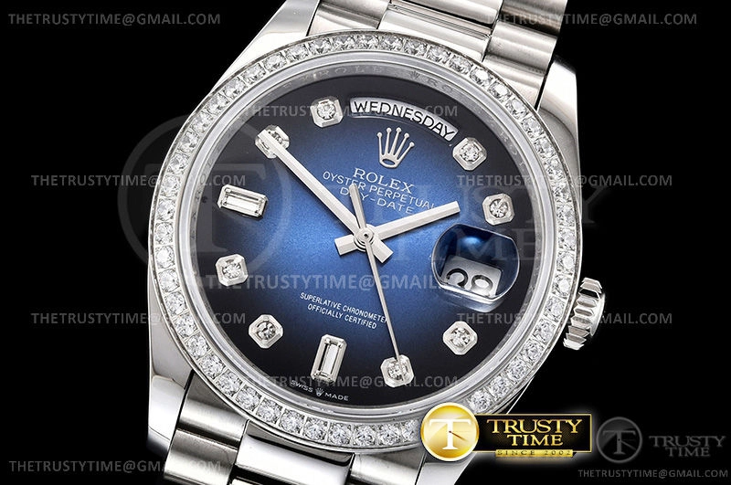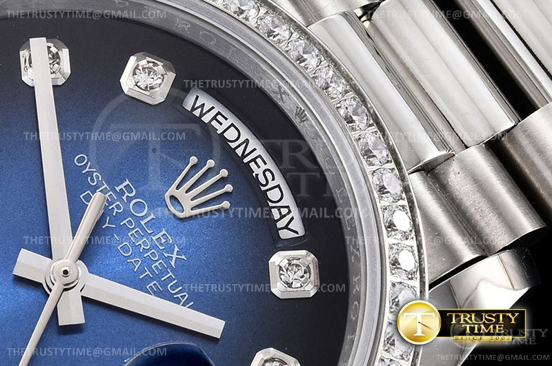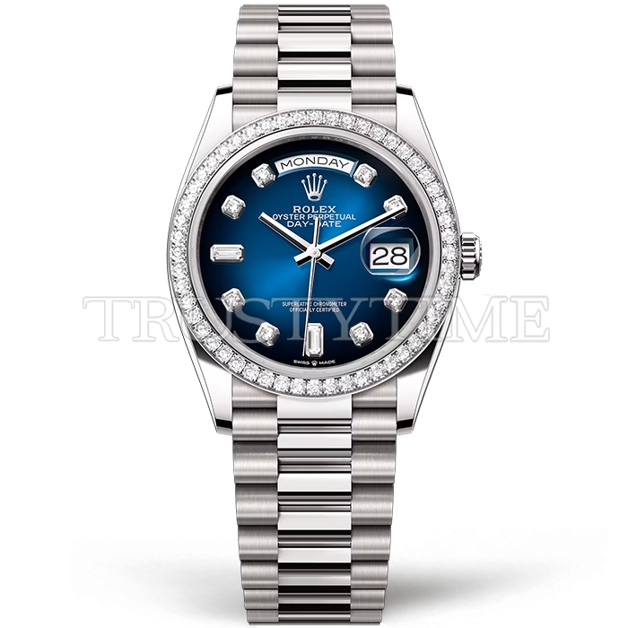 Часы Rolex из коллекции Day-Date. Классические женские часы Rolex Day-Date 36mm 128349RBR-0010 премиального качества (Артикул магазина: RX-1045) оснащены надежным автоматическим механизмом с автоподзаводом (работает от амплитуды движения руки) калибра 3255, в котором реализованы следующие функции: часовая, минутная и секундная стрелки, а так же дата. Круглый корпус часов стального цвета, имеющий размер 36 мм и высоту 12 мм превосходно дополнит образ и украсит запястье своего обладателя. Для изготовления часов Rolex Day-Date 36mm 128349RBR-0010 предлагаемых в нашем интернет-магазине, применяются нержавеющая сталь 904 высокого качества (Швейцарский стандарт), а так же сапфировое стекло высокой прочности, благодаря чему обеспечивается максимальная защита от сколов и механических повреждений. Отличительной чертой данной модели является синий циферблат, часовые индексы которого обеспечивают камни. Завершает образ браслет из нержавеющей стали стального цвета с фирменной раскладывающейся застежкой Rolex. Водонепроницаемость данной модели составляет 30М (WR30) – допускается минимальное воздействие с водой.