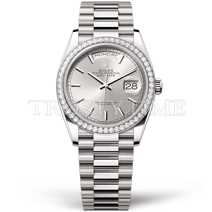 Часы Rolex из коллекции Day-Date. Классические женские часы Rolex Day-Date 36mm 128349RBR-0001 премиального качества (Артикул магазина: RX-1044) оснащены надежным автоматическим механизмом с автоподзаводом (работает от амплитуды движения руки) калибра 3255, в котором реализованы следующие функции: часовая, минутная и секундная стрелки, а так же дата. Круглый корпус часов стального цвета, имеющий размер 36 мм и высоту 12 мм превосходно дополнит образ и украсит запястье своего обладателя. Для изготовления часов Rolex Day-Date 36mm 128349RBR-0001 предлагаемых в нашем интернет-магазине, применяются нержавеющая сталь 904 высокого качества (Швейцарский стандарт), а так же сапфировое стекло высокой прочности, благодаря чему обеспечивается максимальная защита от сколов и механических повреждений. Отличительной чертой данной модели является серебристый циферблат, часовые индексы которого обеспечивают часовые метки. Завершает образ браслет из нержавеющей стали стального цвета с фирменной раскладывающейся застежкой Rolex. Водонепроницаемость данной модели составляет 30М (WR30) – допускается минимальное воздействие с водой.