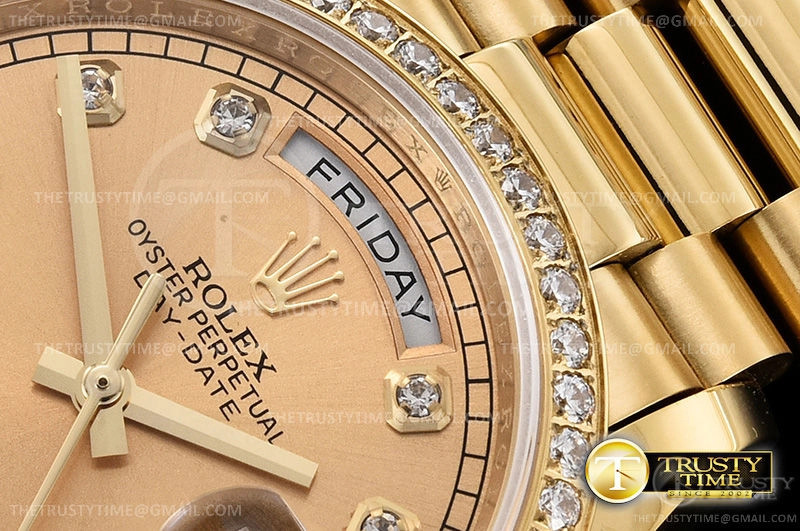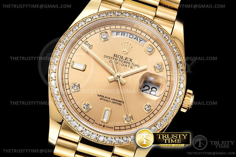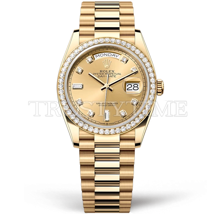 Часы Rolex из коллекции Day-Date. Классические женские часы Rolex Day-Date 36mm 128348RBR-0008 премиального качества (Артикул магазина: RX-1617) оснащены надежным автоматическим механизмом с автоподзаводом (работает от амплитуды движения руки) калибра 3255, в котором реализованы следующие функции: часовая, минутная и секундная стрелки, а так же дата. Круглый корпус часов цветы желтой золота, имеющий размер 36 мм и высоту 12 мм превосходно дополнит образ и украсит запястье своего обладателя. Для изготовления часов Rolex Day-Date 36mm 128348RBR-0008 предлагаемых в нашем интернет-магазине, применяются нержавеющая сталь 904 высокого качества (Швейцарский стандарт), а так же сапфировое стекло высокой прочности, благодаря чему обеспечивается максимальная защита от сколов и механических повреждений. Отличительной чертой данной модели является золотой циферблат, часовые индексы которого обеспечивают камни. Завершает образ браслет из нержавеющей стали цвета желтого золота с фирменной раскладывающейся застежкой Rolex. Водонепроницаемость данной модели составляет 30М (WR30) – допускается минимальное воздействие с водой.