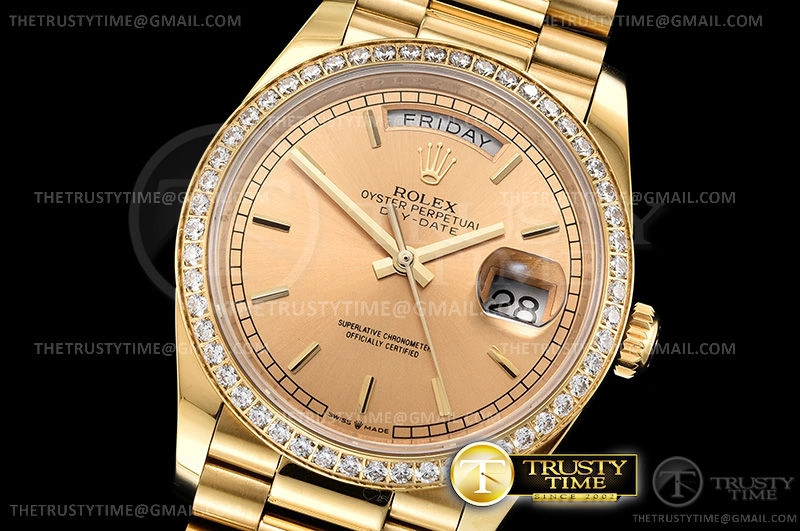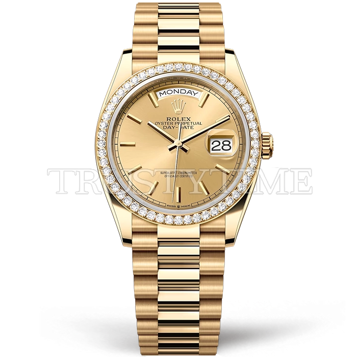 Часы Rolex из коллекции Day-Date. Классические женские часы Rolex Day-Date 36mm 128348RBR-0026 премиального качества (Артикул магазина: RX-1613) оснащены надежным автоматическим механизмом с автоподзаводом (работает от амплитуды движения руки) калибра 3255, в котором реализованы следующие функции: часовая, минутная и секундная стрелки, а так же дата. Круглый корпус часов цветы желтой золота, имеющий размер 36 мм и высоту 12 мм превосходно дополнит образ и украсит запястье своего обладателя. Для изготовления часов Rolex Day-Date 36mm 128348RBR-0026 предлагаемых в нашем интернет-магазине, применяются нержавеющая сталь 904 высокого качества (Швейцарский стандарт), а так же сапфировое стекло высокой прочности, благодаря чему обеспечивается максимальная защита от сколов и механических повреждений. Отличительной чертой данной модели является золотой циферблат, часовые индексы которого обеспечивают часовые метки. Завершает образ браслет из нержавеющей стали цвета желтого золота с фирменной раскладывающейся застежкой Rolex. Водонепроницаемость данной модели составляет 30М (WR30) – допускается минимальное воздействие с водой.