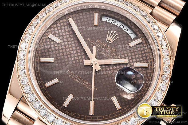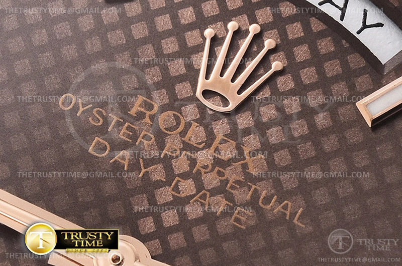 Часы Rolex из коллекции Day-Date. Классические мужские, женские часы Rolex Day-Date 40mm 228345RBR-0005 премиального качества (Артикул магазина: RX-1632) оснащены надежным автоматическим механизмом с автоподзаводом (работает от амплитуды движения руки) калибра 3255, в котором реализованы следующие функции: часовая, минутная и секундная стрелки, а так же дата, день недели. Круглый корпус часов розового цвета, имеющий размер 40 мм и высоту 12 мм превосходно дополнит образ и украсит запястье своего обладателя. Для изготовления часов Rolex Day-Date 40mm 228345RBR-0005 предлагаемых в нашем интернет-магазине, применяются нержавеющая сталь 904 высокого качества (Швейцарский стандарт), а так же сапфировое стекло высокой прочности, благодаря чему обеспечивается максимальная защита от сколов и механических повреждений. Отличительной чертой данной модели является коричневый циферблат, часовые индексы которого обеспечивают часовые метки. Завершает образ браслет из нержавеющей стали цвета розового золота с фирменной раскладывающейся застежкой Rolex. Водонепроницаемость данной модели составляет 30М (WR30) – допускается минимальное воздействие с водой.