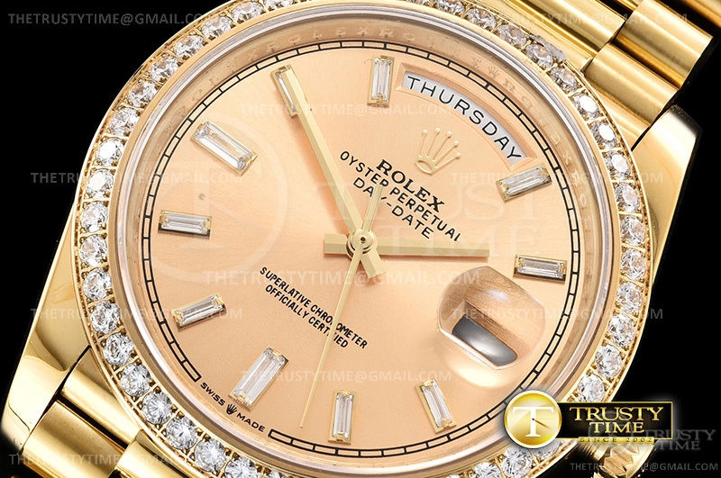 Часы Rolex из коллекции Day-Date. Классические мужские, женские часы Rolex Day-Date 40mm 228348RBR-0002 премиального качества (Артикул магазина: RX-1638) оснащены надежным автоматическим механизмом с автоподзаводом (работает от амплитуды движения руки) калибра 3255, в котором реализованы следующие функции: часовая, минутная и секундная стрелки, а так же дата, день недели. Круглый корпус часов цветы желтой золота, имеющий размер 40 мм и высоту 12 мм превосходно дополнит образ и украсит запястье своего обладателя. Для изготовления часов Rolex Day-Date 40mm 228348RBR-0002 предлагаемых в нашем интернет-магазине, применяются нержавеющая сталь 904 высокого качества (Швейцарский стандарт), а так же сапфировое стекло высокой прочности, благодаря чему обеспечивается максимальная защита от сколов и механических повреждений. Отличительной чертой данной модели является золотой циферблат, часовые индексы которого обеспечивают камни. Завершает образ браслет из нержавеющей стали цвета желтого золота с фирменной раскладывающейся застежкой Rolex. Водонепроницаемость данной модели составляет 30М (WR30) – допускается минимальное воздействие с водой.