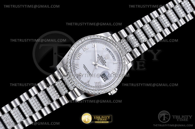 Часы Rolex из коллекции Day-Date. Классические женские часы Rolex Day-Date 36mm 128349RBR-0026 премиального качества (Артикул магазина: RX-1976) оснащены надежным автоматическим механизмом с автоподзаводом (работает от амплитуды движения руки) калибра 3255, в котором реализованы следующие функции: часовая, минутная и секундная стрелки, а так же дата, день недели. Круглый корпус часов стального цвета, имеющий размер 36 мм и высоту 12 мм превосходно дополнит образ и украсит запястье своего обладателя. Для изготовления часов Rolex Day-Date 36mm 128349RBR-0026 предлагаемых в нашем интернет-магазине, применяются нержавеющая сталь 904 высокого качества (Швейцарский стандарт), а так же сапфировое стекло высокой прочности, благодаря чему обеспечивается максимальная защита от сколов и механических повреждений. Отличительной чертой данной модели является белый циферблат, часовые индексы которого обеспечивают римские цифры. Завершает образ браслет из нержавеющей стали стального цвета с фирменной раскладывающейся застежкой Rolex. Водонепроницаемость данной модели составляет 30М (WR30) – допускается минимальное воздействие с водой.
