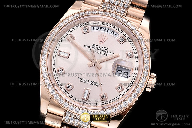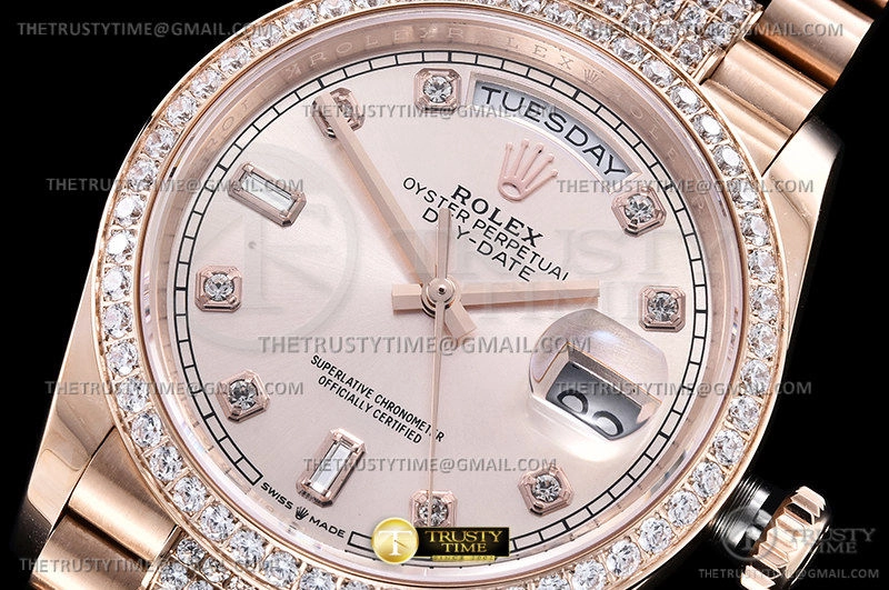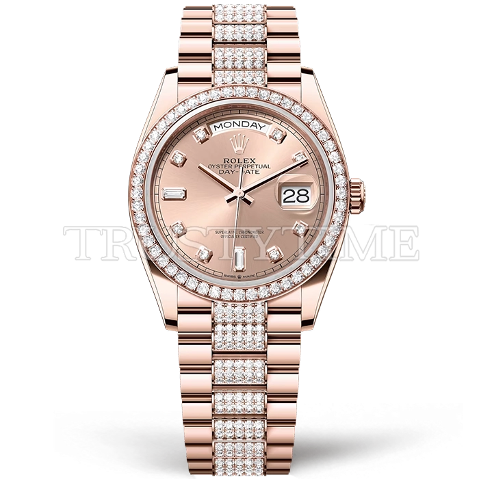 Часы Rolex из коллекции Day-Date. Классические женские часы Rolex Day-Date 36mm 128345RBR-0020 премиального качества (Артикул магазина: RX-1982) оснащены надежным автоматическим механизмом с автоподзаводом (работает от амплитуды движения руки) калибра 3255, в котором реализованы следующие функции: часовая, минутная и секундная стрелки, а так же дата, день недели. Круглый корпус часов розового цвета, имеющий размер 36 мм и высоту 12 мм превосходно дополнит образ и украсит запястье своего обладателя. Для изготовления часов Rolex Day-Date 36mm 128345RBR-0020 предлагаемых в нашем интернет-магазине, применяются нержавеющая сталь 904 высокого качества (Швейцарский стандарт), а так же сапфировое стекло высокой прочности, благодаря чему обеспечивается максимальная защита от сколов и механических повреждений. Отличительной чертой данной модели является золотой циферблат, часовые индексы которого обеспечивают камни. Завершает образ браслет из нержавеющей стали цвета розового золота с фирменной раскладывающейся застежкой Rolex. Водонепроницаемость данной модели составляет 30М (WR30) – допускается минимальное воздействие с водой.