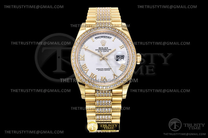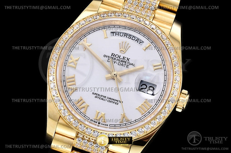 Часы Rolex из коллекции Day-Date. Классические женские часы Rolex Day-Date 36mm 128348RBR-0043 премиального качества (Артикул магазина: RX-1983) оснащены надежным автоматическим механизмом с автоподзаводом (работает от амплитуды движения руки) калибра 3255, в котором реализованы следующие функции: часовая, минутная и секундная стрелки, а так же дата, день недели. Круглый корпус часов цветы желтой золота, имеющий размер 36 мм и высоту 12 мм превосходно дополнит образ и украсит запястье своего обладателя. Для изготовления часов Rolex Day-Date 36mm 128348RBR-0043 предлагаемых в нашем интернет-магазине, применяются нержавеющая сталь 904 высокого качества (Швейцарский стандарт), а так же сапфировое стекло высокой прочности, благодаря чему обеспечивается максимальная защита от сколов и механических повреждений. Отличительной чертой данной модели является белый циферблат, часовые индексы которого обеспечивают римские цифры. Завершает образ браслет из нержавеющей стали цвета желтого золота с фирменной раскладывающейся застежкой Rolex. Водонепроницаемость данной модели составляет 30М (WR30) – допускается минимальное воздействие с водой.