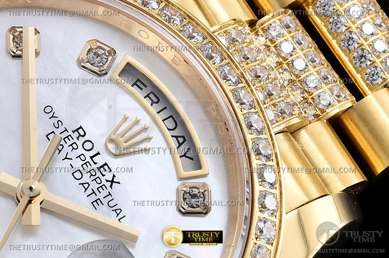 Часы Rolex из коллекции Day-Date. Классические женские часы Rolex Day-Date 36mm 128348RBR-0019 премиального качества (Артикул магазина: RX-1986) оснащены надежным автоматическим механизмом с автоподзаводом (работает от амплитуды движения руки) калибра 3255, в котором реализованы следующие функции: часовая, минутная и секундная стрелки, а так же дата, день недели. Круглый корпус часов цветы желтой золота, имеющий размер 36 мм и высоту 12 мм превосходно дополнит образ и украсит запястье своего обладателя. Для изготовления часов Rolex Day-Date 36mm 128348RBR-0019 предлагаемых в нашем интернет-магазине, применяются нержавеющая сталь 904 высокого качества (Швейцарский стандарт), а так же сапфировое стекло высокой прочности, благодаря чему обеспечивается максимальная защита от сколов и механических повреждений. Отличительной чертой данной модели является перламутровый циферблат, часовые индексы которого обеспечивают камни. Завершает образ браслет из нержавеющей стали цвета желтого золота с фирменной раскладывающейся застежкой Rolex. Водонепроницаемость данной модели составляет 30М (WR30) – допускается минимальное воздействие с водой.