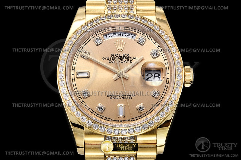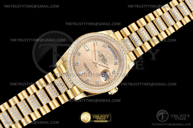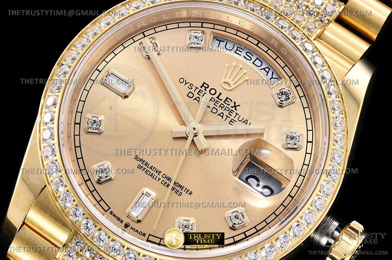 Часы Rolex из коллекции Day-Date. Классические женские часы Rolex Day-Date 36mm 128348RBR-0010 премиального качества (Артикул магазина: RX-1987) оснащены надежным автоматическим механизмом с автоподзаводом (работает от амплитуды движения руки) калибра 3255, в котором реализованы следующие функции: часовая, минутная и секундная стрелки, а так же дата, день недели. Круглый корпус часов цветы желтой золота, имеющий размер 36 мм и высоту 12 мм превосходно дополнит образ и украсит запястье своего обладателя. Для изготовления часов Rolex Day-Date 36mm 128348RBR-0010 предлагаемых в нашем интернет-магазине, применяются нержавеющая сталь 904 высокого качества (Швейцарский стандарт), а так же сапфировое стекло высокой прочности, благодаря чему обеспечивается максимальная защита от сколов и механических повреждений. Отличительной чертой данной модели является золотой циферблат, часовые индексы которого обеспечивают камни. Завершает образ браслет из нержавеющей стали цвета желтого золота с фирменной раскладывающейся застежкой Rolex. Водонепроницаемость данной модели составляет 30М (WR30) – допускается минимальное воздействие с водой.