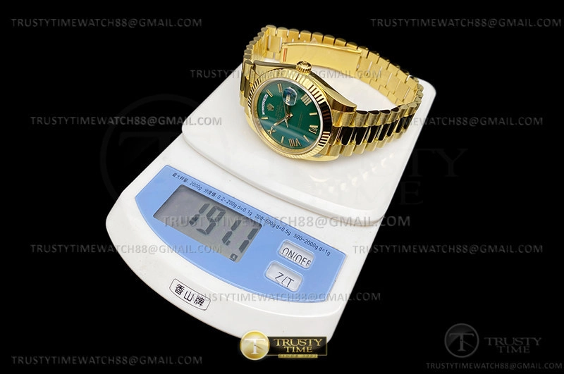Часы Rolex из коллекции Day-Date. Классические мужские часы Rolex Day-Date 40mm 228238-0061 премиального качества (Артикул магазина: RX-2340) оснащены надежным автоматическим механизмом с автоподзаводом (работает от амплитуды движения руки) калибра 3255, в котором реализованы следующие функции: часовая, минутная и секундная стрелки, а так же дата, день недели. Круглый корпус часов цветы желтой золота, имеющий размер 40 мм и высоту 12 мм превосходно дополнит образ и украсит запястье своего обладателя. Для изготовления часов Rolex Day-Date 40mm 228238-0061 предлагаемых в нашем интернет-магазине, применяются нержавеющая сталь 904 высокого качества (Швейцарский стандарт), а так же сапфировое стекло высокой прочности, благодаря чему обеспечивается максимальная защита от сколов и механических повреждений. Отличительной чертой данной модели является зеленый циферблат, часовые индексы которого обеспечивают римские цифры. Завершает образ браслет из нержавеющей стали цвета желтого золота с фирменной раскладывающейся застежкой Rolex. Водонепроницаемость данной модели составляет 30М (WR30) – допускается минимальное воздействие с водой.