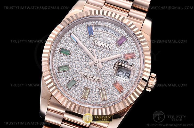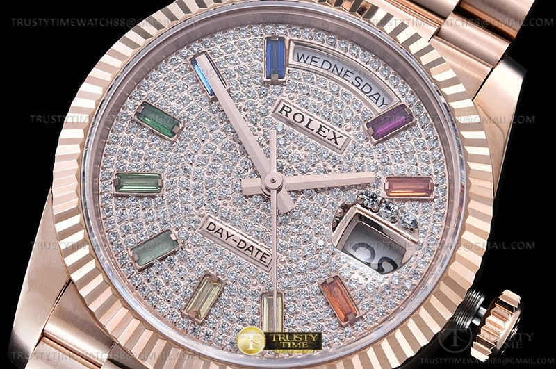 Часы Rolex из коллекции Day-Date. Классические женские часы Rolex Day-Date 36mm 128235-0039 премиального качества (Артикул магазина: RX-2703) оснащены надежным автоматическим механизмом с автоподзаводом (работает от амплитуды движения руки) калибра 3255, в котором реализованы следующие функции: часовая, минутная и секундная стрелки, а так же дата, день недели. Круглый корпус часов розового цвета, имеющий размер 36 мм и высоту 12 мм превосходно дополнит образ и украсит запястье своего обладателя. Для изготовления часов Rolex Day-Date 36mm 128235-0039 предлагаемых в нашем интернет-магазине, применяются нержавеющая сталь 904 высокого качества (Швейцарский стандарт), а так же сапфировое стекло высокой прочности, благодаря чему обеспечивается максимальная защита от сколов и механических повреждений. Отличительной чертой данной модели является золотой циферблат, часовые индексы которого обеспечивают камни. Завершает образ браслет из нержавеющей стали цвета розового золота с фирменной раскладывающейся застежкой Rolex. Водонепроницаемость данной модели составляет 30М (WR30) – допускается минимальное воздействие с водой.