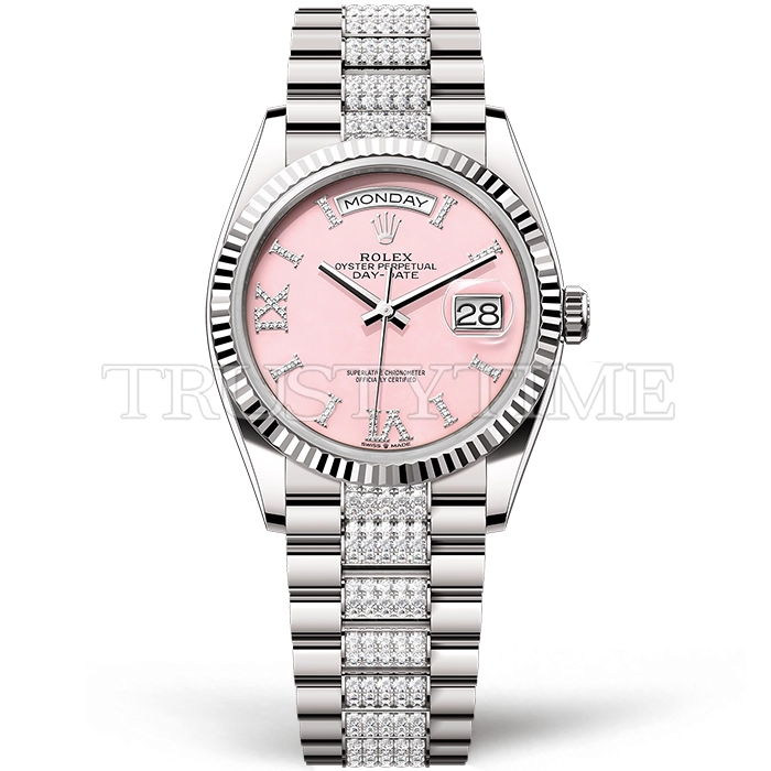Часы Rolex из коллекции Day-Date. Классические женские часы Rolex Day-Date 36mm 128239-0030 премиального качества (Артикул магазина: RX-2718) оснащены надежным автоматическим механизмом с автоподзаводом (работает от амплитуды движения руки) калибра 3255, в котором реализованы следующие функции: часовая, минутная и секундная стрелки, а так же дата, день недели. Круглый корпус часов стального цвета, имеющий размер 36 мм и высоту 12 мм превосходно дополнит образ и украсит запястье своего обладателя. Для изготовления часов Rolex Day-Date 36mm 128239-0030 предлагаемых в нашем интернет-магазине, применяются нержавеющая сталь 904 высокого качества (Швейцарский стандарт), а так же сапфировое стекло высокой прочности, благодаря чему обеспечивается максимальная защита от сколов и механических повреждений. Отличительной чертой данной модели является розовый циферблат, часовые индексы которого обеспечивают римские цифры. Завершает образ браслет из нержавеющей стали стального цвета с фирменной раскладывающейся застежкой Rolex. Водонепроницаемость данной модели составляет 30М (WR30) – допускается минимальное воздействие с водой.