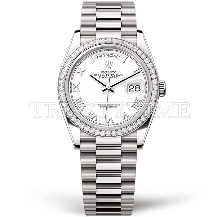 Часы Rolex из коллекции Day-Date. Классические женские часы Rolex Day-Date 36mm 128349RBR-0025 премиального качества (Артикул магазина: RX-2735) оснащены надежным автоматическим механизмом с автоподзаводом (работает от амплитуды движения руки) калибра 3255, в котором реализованы следующие функции: часовая, минутная и секундная стрелки, а так же дата, день недели. Круглый корпус часов стального цвета, имеющий размер 36 мм и высоту 12 мм превосходно дополнит образ и украсит запястье своего обладателя. Для изготовления часов Rolex Day-Date 36mm 128349RBR-0025 предлагаемых в нашем интернет-магазине, применяются нержавеющая сталь 904 высокого качества (Швейцарский стандарт), а так же сапфировое стекло высокой прочности, благодаря чему обеспечивается максимальная защита от сколов и механических повреждений. Отличительной чертой данной модели является белый циферблат, часовые индексы которого обеспечивают римские цифры. Завершает образ браслет из нержавеющей стали стального цвета с фирменной раскладывающейся застежкой Rolex. Водонепроницаемость данной модели составляет 30М (WR30) – допускается минимальное воздействие с водой.