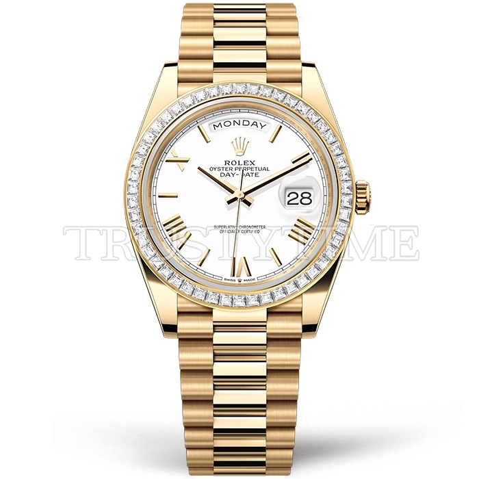 Часы Rolex из коллекции Day-Date. Классические мужские часы Rolex Day-Date 40mm 228398TBR-0033 премиального качества (Артикул магазина: RX-2796) оснащены надежным автоматическим механизмом с автоподзаводом (работает от амплитуды движения руки) калибра 3255, в котором реализованы следующие функции: часовая, минутная и секундная стрелки, а так же дата, день недели. Круглый корпус часов цветы желтой золота, имеющий размер 40 мм и высоту 12 мм превосходно дополнит образ и украсит запястье своего обладателя. Для изготовления часов Rolex Day-Date 40mm 228398TBR-0033 предлагаемых в нашем интернет-магазине, применяются нержавеющая сталь 904 высокого качества (Швейцарский стандарт), а так же сапфировое стекло высокой прочности, благодаря чему обеспечивается максимальная защита от сколов и механических повреждений. Отличительной чертой данной модели является белый циферблат, часовые индексы которого обеспечивают римские цифры. Завершает образ браслет из нержавеющей стали цвета желтого золота с фирменной раскладывающейся застежкой Rolex. Водонепроницаемость данной модели составляет 30М (WR30) – допускается минимальное воздействие с водой.