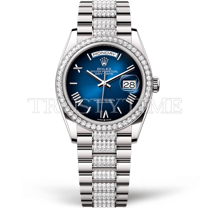 Часы Rolex из коллекции Day-Date. Классические женские часы Rolex Day-Date 36mm 128349RBR-0048 премиального качества (Артикул магазина: RX-3435) оснащены надежным автоматическим механизмом с автоподзаводом (работает от амплитуды движения руки) калибра 3255, в котором реализованы следующие функции: часовая, минутная и секундная стрелки, а так же дата, день недели. Круглый корпус часов стального цвета, имеющий размер 36 мм и высоту 12 мм превосходно дополнит образ и украсит запястье своего обладателя. Для изготовления часов Rolex Day-Date 36mm 128349RBR-0048 предлагаемых в нашем интернет-магазине, применяются нержавеющая сталь 904 высокого качества (Швейцарский стандарт), а так же сапфировое стекло высокой прочности, благодаря чему обеспечивается максимальная защита от сколов и механических повреждений. Отличительной чертой данной модели является синий циферблат, часовые индексы которого обеспечивают римские цифры. Завершает образ браслет из нержавеющей стали стального цвета с фирменной раскладывающейся застежкой Rolex. Водонепроницаемость данной модели составляет 30М (WR30) – допускается минимальное воздействие с водой.