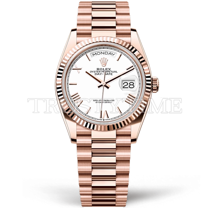 Часы Rolex из коллекции Day-Date. Классические женские часы Rolex Day-Date 36mm 128235-0070 премиального качества (Артикул магазина: RX-3604) оснащены надежным автоматическим механизмом с автоподзаводом (работает от амплитуды движения руки) калибра 3255, в котором реализованы следующие функции: часовая, минутная и секундная стрелки, а так же дата, день недели. Круглый корпус часов розового цвета, имеющий размер 36 мм и высоту 12 мм превосходно дополнит образ и украсит запястье своего обладателя. Для изготовления часов Rolex Day-Date 36mm 128235-0070 предлагаемых в нашем интернет-магазине, применяются нержавеющая сталь 904 высокого качества (Швейцарский стандарт), а так же сапфировое стекло высокой прочности, благодаря чему обеспечивается максимальная защита от сколов и механических повреждений. Отличительной чертой данной модели является белый циферблат, часовые индексы которого обеспечивают римские цифры. Завершает образ браслет из нержавеющей стали цвета розового золота с фирменной раскладывающейся застежкой Rolex. Водонепроницаемость данной модели составляет 30М (WR30) – допускается минимальное воздействие с водой.