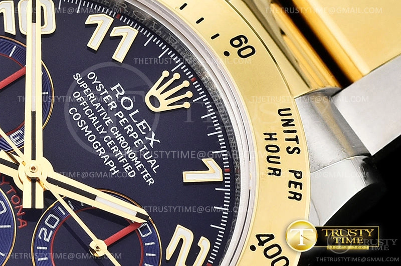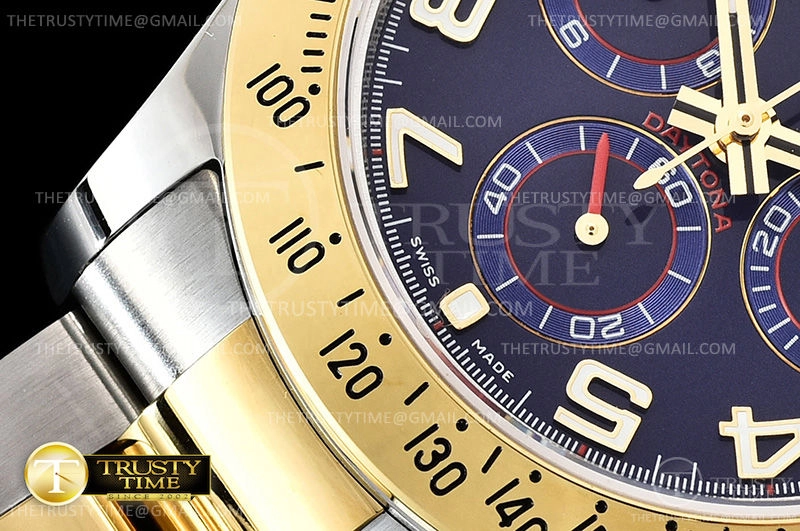 Часы Rolex из коллекции Daytona. Спортивные мужские часы Rolex Cosmograph Daytona 116523-0045 премиального качества (Артикул магазина: RX-1157) оснащены надежным автоматическим механизмом с автоподзаводом (работает от амплитуды движения руки) калибра 4130, в котором реализованы следующие функции: часовая, минутная и секундная стрелки, а так же хронограф. Круглый корпус часов комбинированного сталь с желтого золота цвета, имеющий размер 40 мм и высоту 12.5 мм превосходно дополнит образ и украсит запястье своего обладателя. Для изготовления часов Rolex Cosmograph Daytona 116523-0045 предлагаемых в нашем интернет-магазине, применяются нержавеющая сталь 316L высокого качества (Швейцарский стандарт), а так же сапфировое стекло высокой прочности, благодаря чему обеспечивается максимальная защита от сколов и механических повреждений. Отличительной чертой данной модели является синий циферблат, часовые индексы которого обеспечивают арабские цифры. Завершает образ браслет из нержавеющей стали комбинированного сталь с желтым золотом цвета с фирменной раскладывающейся застежкой Rolex. Водонепроницаемость данной модели составляет 100М (WR100) – в таких часах можно плавать и нырять без акваланга в морской и пресной воде, а также заниматься водными видами спорта.