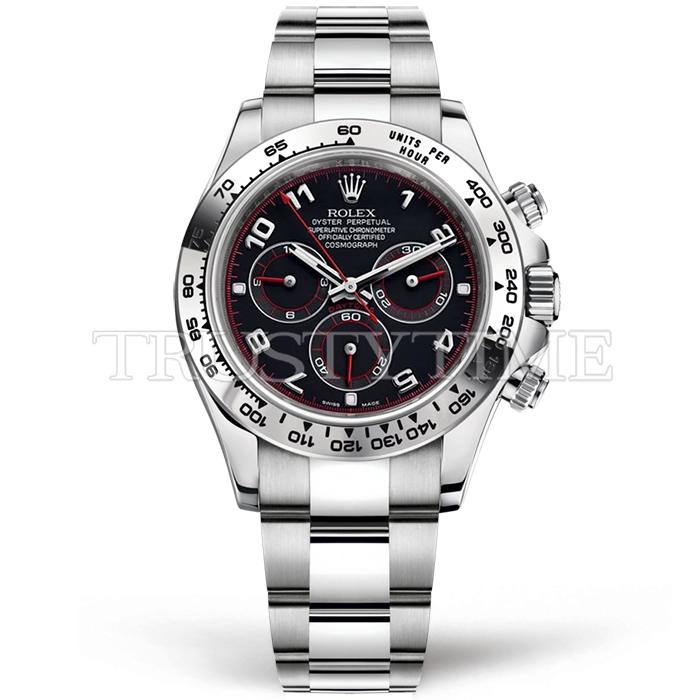 Часы Rolex из коллекции Daytona. Спортивные мужские часы Rolex Cosmograph Daytona 116509-0036 премиального качества (Артикул магазина: RX-1070) оснащены надежным автоматическим механизмом с автоподзаводом (работает от амплитуды движения руки) калибра 4130, в котором реализованы следующие функции: часовая, минутная и секундная стрелки, а так же хронограф. Круглый корпус часов стального цвета, имеющий размер 40 мм и высоту 12.5 мм превосходно дополнит образ и украсит запястье своего обладателя. Для изготовления часов Rolex Cosmograph Daytona 116509-0036 предлагаемых в нашем интернет-магазине, применяются нержавеющая сталь 904L высокого качества (Швейцарский стандарт), а так же сапфировое стекло высокой прочности, благодаря чему обеспечивается максимальная защита от сколов и механических повреждений. Отличительной чертой данной модели является черный циферблат, часовые индексы которого обеспечивают арабские цифры. Завершает образ браслет из нержавеющей стали стального цвета с фирменной раскладывающейся застежкой Rolex. Водонепроницаемость данной модели составляет 100М (WR100) – в таких часах можно плавать и нырять без акваланга в морской и пресной воде, а также заниматься водными видами спорта.