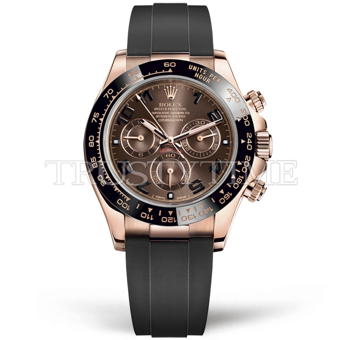Часы Rolex из коллекции Daytona. Спортивные мужские часы Rolex Cosmograph Daytona 116515LN-0055 премиального качества (Артикул магазина: RX-1053) оснащены надежным автоматическим механизмом с автоподзаводом (работает от амплитуды движения руки) калибра 4130, в котором реализованы следующие функции: часовая, минутная и секундная стрелки, а так же хронограф. Круглый корпус часов розового цвета, имеющий размер 40 мм и высоту 12.5 мм превосходно дополнит образ и украсит запястье своего обладателя. Для изготовления часов Rolex Cosmograph Daytona 116515LN-0055 предлагаемых в нашем интернет-магазине, применяются нержавеющая сталь 904L высокого качества (Швейцарский стандарт), а так же сапфировое стекло высокой прочности, благодаря чему обеспечивается максимальная защита от сколов и механических повреждений. Отличительной чертой данной модели является коричневый циферблат, часовые индексы которого обеспечивают арабские цифры. Завершает образ каучуковый ремешок черного цвета с фирменной раскладывающейся застежкой Rolex. Водонепроницаемость данной модели составляет 100М (WR100) – в таких часах можно плавать и нырять без акваланга в морской и пресной воде, а также заниматься водными видами спорта.