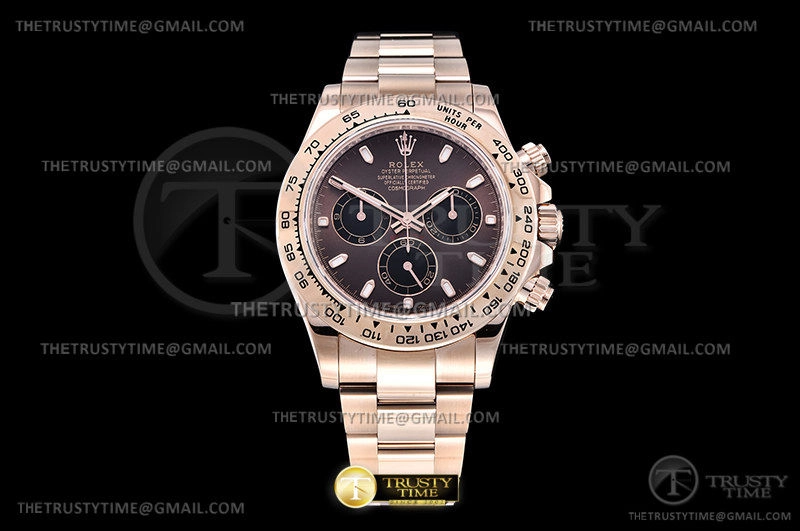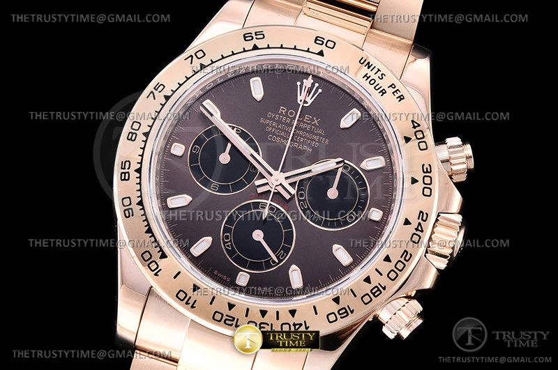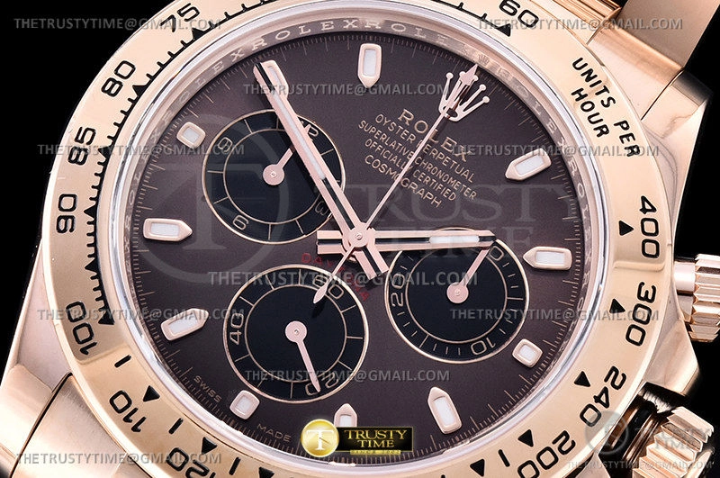 Часы Rolex из коллекции Daytona. Спортивные мужские часы Rolex Cosmograph Daytona 116505-0013 премиального качества (Артикул магазина: RX-1820) оснащены надежным автоматическим механизмом с автоподзаводом (работает от амплитуды движения руки) калибра 4130, в котором реализованы следующие функции: часовая, минутная и секундная стрелки, а так же хронограф. Круглый корпус часов розового цвета, имеющий размер 40 мм и высоту 12.5 мм превосходно дополнит образ и украсит запястье своего обладателя. Для изготовления часов Rolex Cosmograph Daytona 116505-0013 предлагаемых в нашем интернет-магазине, применяются нержавеющая сталь 904L высокого качества (Швейцарский стандарт), а так же сапфировое стекло высокой прочности, благодаря чему обеспечивается максимальная защита от сколов и механических повреждений. Отличительной чертой данной модели является коричневый циферблат, часовые индексы которого обеспечивают часовые метки. Завершает образ браслет из нержавеющей стали цвета розового золота с фирменной раскладывающейся застежкой Rolex. Водонепроницаемость данной модели составляет 100М (WR100) – в таких часах можно плавать и нырять без акваланга в морской и пресной воде, а также заниматься водными видами спорта.