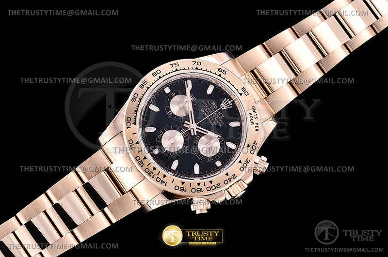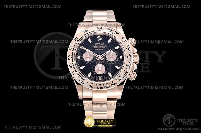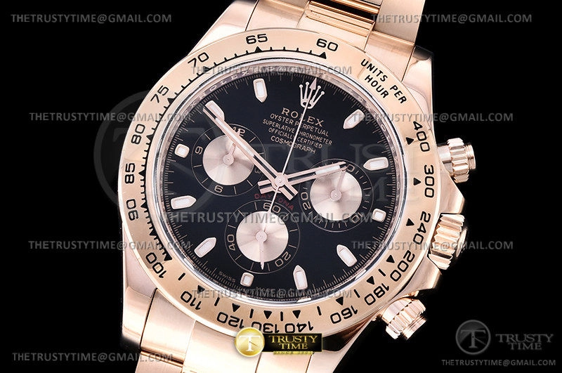 Часы Rolex из коллекции Daytona. Спортивные мужские часы Rolex Cosmograph Daytona 116505-0008 премиального качества (Артикул магазина: RX-1821) оснащены надежным автоматическим механизмом с автоподзаводом (работает от амплитуды движения руки) калибра 4130, в котором реализованы следующие функции: часовая, минутная и секундная стрелки, а так же хронограф. Круглый корпус часов розового цвета, имеющий размер 40 мм и высоту 12.5 мм превосходно дополнит образ и украсит запястье своего обладателя. Для изготовления часов Rolex Cosmograph Daytona 116505-0008 предлагаемых в нашем интернет-магазине, применяются нержавеющая сталь 904L высокого качества (Швейцарский стандарт), а так же сапфировое стекло высокой прочности, благодаря чему обеспечивается максимальная защита от сколов и механических повреждений. Отличительной чертой данной модели является черный циферблат, часовые индексы которого обеспечивают часовые метки. Завершает образ браслет из нержавеющей стали цвета розового золота с фирменной раскладывающейся застежкой Rolex. Водонепроницаемость данной модели составляет 100М (WR100) – в таких часах можно плавать и нырять без акваланга в морской и пресной воде, а также заниматься водными видами спорта.