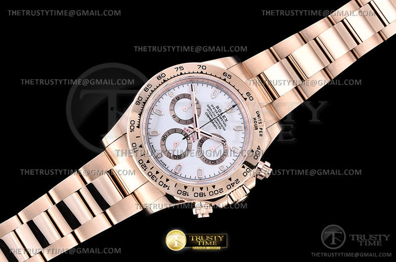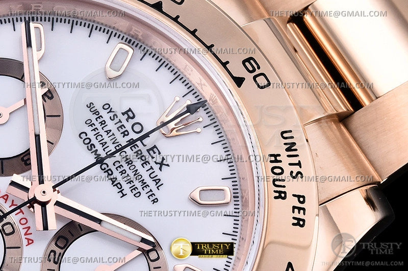 Часы Rolex из коллекции Daytona. Спортивные мужские часы Rolex Cosmograph Daytona 116505-0010 премиального качества (Артикул магазина: RX-1822) оснащены надежным автоматическим механизмом с автоподзаводом (работает от амплитуды движения руки) калибра 4130, в котором реализованы следующие функции: часовая, минутная и секундная стрелки, а так же хронограф. Круглый корпус часов розового цвета, имеющий размер 40 мм и высоту 12.5 мм превосходно дополнит образ и украсит запястье своего обладателя. Для изготовления часов Rolex Cosmograph Daytona 116505-0010 предлагаемых в нашем интернет-магазине, применяются нержавеющая сталь 904L высокого качества (Швейцарский стандарт), а так же сапфировое стекло высокой прочности, благодаря чему обеспечивается максимальная защита от сколов и механических повреждений. Отличительной чертой данной модели является белый циферблат, часовые индексы которого обеспечивают часовые метки. Завершает образ браслет из нержавеющей стали цвета розового золота с фирменной раскладывающейся застежкой Rolex. Водонепроницаемость данной модели составляет 100М (WR100) – в таких часах можно плавать и нырять без акваланга в морской и пресной воде, а также заниматься водными видами спорта.