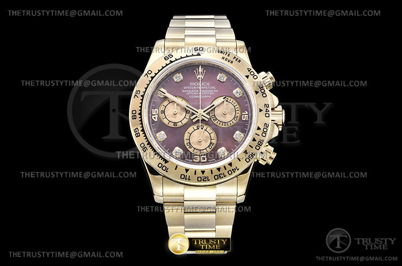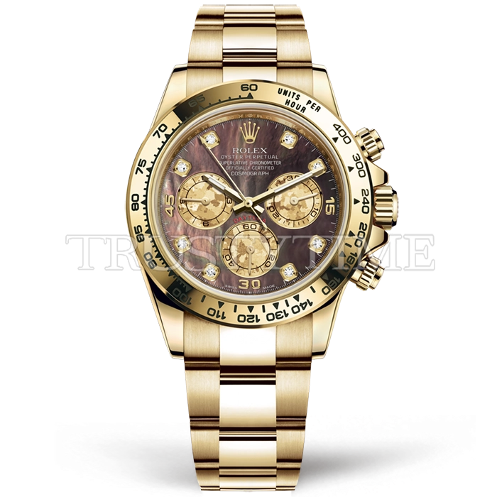 Часы Rolex из коллекции Daytona. Спортивные мужские часы Rolex Cosmograph Daytona 116508-0011 премиального качества (Артикул магазина: RX-1839) оснащены надежным автоматическим механизмом с автоподзаводом (работает от амплитуды движения руки) калибра 4130, в котором реализованы следующие функции: часовая, минутная и секундная стрелки, а так же хронограф. Круглый корпус часов цветы желтой золота, имеющий размер 40 мм и высоту 12.5 мм превосходно дополнит образ и украсит запястье своего обладателя. Для изготовления часов Rolex Cosmograph Daytona 116508-0011 предлагаемых в нашем интернет-магазине, применяются нержавеющая сталь 904L высокого качества (Швейцарский стандарт), а так же сапфировое стекло высокой прочности, благодаря чему обеспечивается максимальная защита от сколов и механических повреждений. Отличительной чертой данной модели является коричневый циферблат, часовые индексы которого обеспечивают камни. Завершает образ браслет из нержавеющей стали цвета желтого золота с фирменной раскладывающейся застежкой Rolex. Водонепроницаемость данной модели составляет 100М (WR100) – в таких часах можно плавать и нырять без акваланга в морской и пресной воде, а также заниматься водными видами спорта.