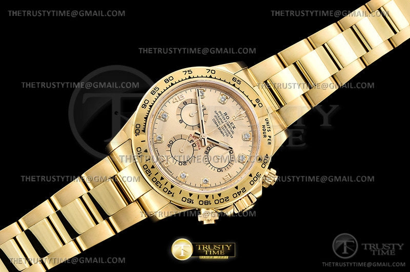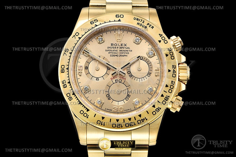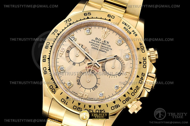 Часы Rolex из коллекции Daytona. Спортивные мужские часы Rolex Cosmograph Daytona 116508-0006 премиального качества (Артикул магазина: RX-1872) оснащены надежным автоматическим механизмом с автоподзаводом (работает от амплитуды движения руки) калибра 4130, в котором реализованы следующие функции: часовая, минутная и секундная стрелки, а так же хронограф. Круглый корпус часов цветы желтой золота, имеющий размер 40 мм и высоту 12.5 мм превосходно дополнит образ и украсит запястье своего обладателя. Для изготовления часов Rolex Cosmograph Daytona 116508-0006 предлагаемых в нашем интернет-магазине, применяются нержавеющая сталь 904L высокого качества (Швейцарский стандарт), а так же сапфировое стекло высокой прочности, благодаря чему обеспечивается максимальная защита от сколов и механических повреждений. Отличительной чертой данной модели является золотой циферблат, часовые индексы которого обеспечивают камни. Завершает образ браслет из нержавеющей стали цвета желтого золота с фирменной раскладывающейся застежкой Rolex. Водонепроницаемость данной модели составляет 100М (WR100) – в таких часах можно плавать и нырять без акваланга в морской и пресной воде, а также заниматься водными видами спорта.
