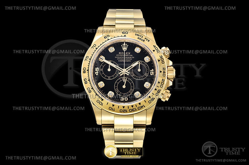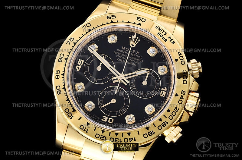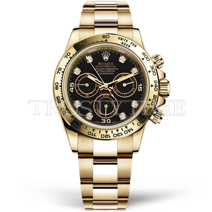 Часы Rolex из коллекции Daytona. Спортивные мужские часы Rolex Cosmograph Daytona 116508-0008 премиального качества (Артикул магазина: RX-1873) оснащены надежным автоматическим механизмом с автоподзаводом (работает от амплитуды движения руки) калибра 4130, в котором реализованы следующие функции: часовая, минутная и секундная стрелки, а так же хронограф. Круглый корпус часов цветы желтой золота, имеющий размер 40 мм и высоту 12.5 мм превосходно дополнит образ и украсит запястье своего обладателя. Для изготовления часов Rolex Cosmograph Daytona 116508-0008 предлагаемых в нашем интернет-магазине, применяются нержавеющая сталь 904L высокого качества (Швейцарский стандарт), а так же сапфировое стекло высокой прочности, благодаря чему обеспечивается максимальная защита от сколов и механических повреждений. Отличительной чертой данной модели является черный циферблат, часовые индексы которого обеспечивают камни. Завершает образ браслет из нержавеющей стали цвета желтого золота с фирменной раскладывающейся застежкой Rolex. Водонепроницаемость данной модели составляет 100М (WR100) – в таких часах можно плавать и нырять без акваланга в морской и пресной воде, а также заниматься водными видами спорта.