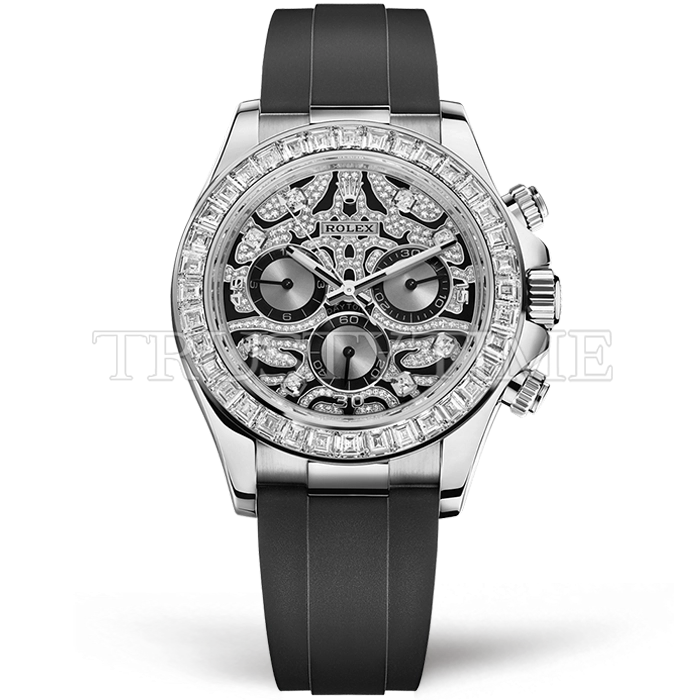 Часы Rolex из коллекции Daytona. Спортивные мужские часы Rolex Cosmograph Daytona 116589TBR премиального качества (Артикул магазина: RX-2350) оснащены надежным автоматическим механизмом с автоподзаводом (работает от амплитуды движения руки) калибра 4130, в котором реализованы следующие функции: часовая, минутная и секундная стрелки, а так же хронограф. Круглый корпус часов стального цвета, имеющий размер 40 мм и высоту 12.5 мм превосходно дополнит образ и украсит запястье своего обладателя. Для изготовления часов Rolex Cosmograph Daytona 116589TBR предлагаемых в нашем интернет-магазине, применяются нержавеющая сталь высокого качества (Швейцарский стандарт), а так же сапфировое стекло высокой прочности, благодаря чему обеспечивается максимальная защита от сколов и механических повреждений. Отличительной чертой данной модели является серебристый циферблат, часовые индексы которого обеспечивают камни. Завершает образ каучуковый ремешок черного цвета с фирменной раскладывающейся застежкой Rolex. Водонепроницаемость данной модели составляет 30М (WR30) – допускается минимальное воздействие с водой.