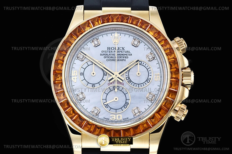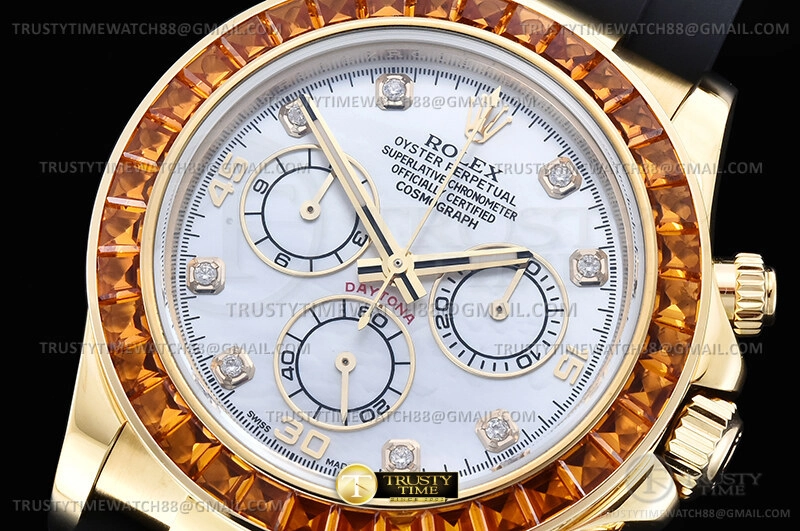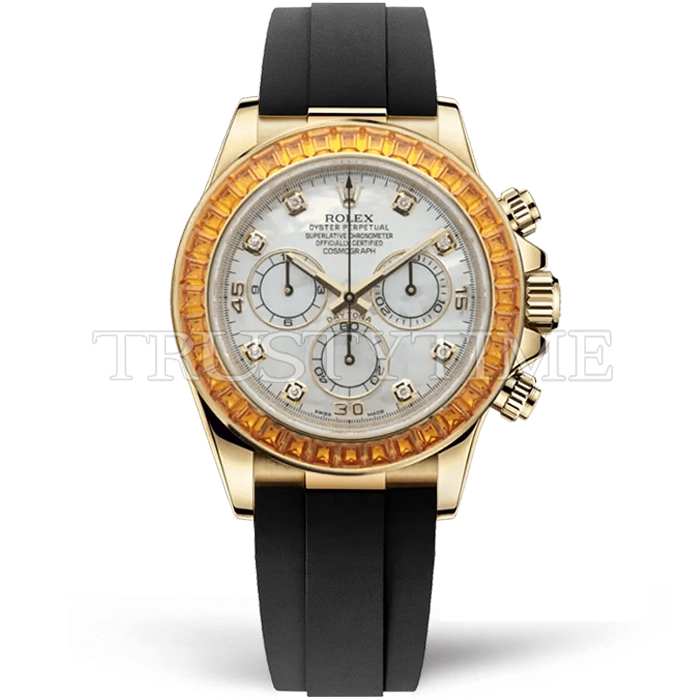 Часы Rolex из коллекции Daytona. Спортивные мужские часы Rolex Cosmograph Daytona Orange Sapphire 116578SACO премиального качества (Артикул магазина: RX-3564) оснащены надежным автоматическим механизмом с автоподзаводом (работает от амплитуды движения руки) калибра 4131, в котором реализованы следующие функции: часовая, минутная и секундная стрелки, а так же хронограф. Круглый корпус часов цветы желтой золота, имеющий размер 40 мм и высоту 12 мм превосходно дополнит образ и украсит запястье своего обладателя. Для изготовления часов Rolex Cosmograph Daytona Orange Sapphire 116578SACO предлагаемых в нашем интернет-магазине, применяются нержавеющая сталь 904L высокого качества (Швейцарский стандарт), а так же сапфировое стекло высокой прочности, благодаря чему обеспечивается максимальная защита от сколов и механических повреждений. Отличительной чертой данной модели является перламутровый циферблат, часовые индексы которого обеспечивают камни. Завершает образ каучуковый ремешок черного цвета с фирменной раскладывающейся застежкой Rolex. Водонепроницаемость данной модели составляет 100М (WR100) – в таких часах можно плавать и нырять без акваланга в морской и пресной воде, а также заниматься водными видами спорта.