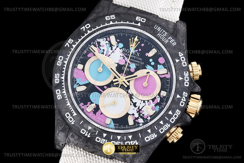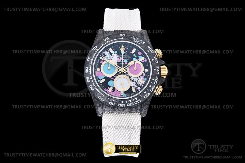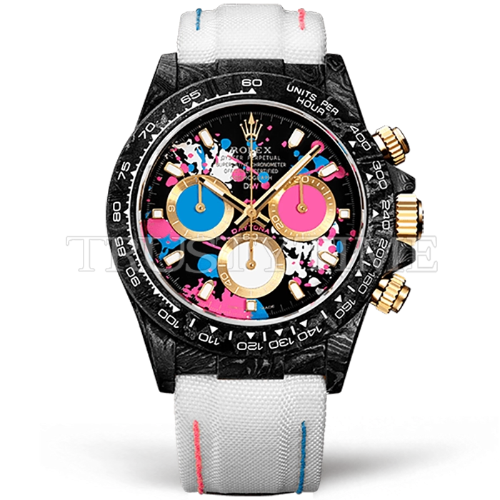 Часы Rolex из коллекции Daytona DIW. Спортивные мужские часы Rolex Cosmograph Daytona DIW Motley Lady премиального качества (Артикул магазина: RX-2299) оснащены надежным автоматическим механизмом с автоподзаводом (работает от амплитуды движения руки) калибра 4130, в котором реализованы следующие функции: часовая, минутная и секундная стрелки, а так же хронограф. Круглый корпус часов черного цвета, имеющий размер 40 мм и высоту 12.5 мм превосходно дополнит образ и украсит запястье своего обладателя. Для изготовления часов Rolex Cosmograph Daytona DIW Motley Lady предлагаемых в нашем интернет-магазине, применяются кованый карбон высокого качества (Швейцарский стандарт), а так же сапфировое стекло высокой прочности, благодаря чему обеспечивается максимальная защита от сколов и механических повреждений. Отличительной чертой данной модели является черный циферблат, часовые индексы которого обеспечивают часовые метки. Завершает образ нейлоновый ремешок белого цвета на липучке Rolex. Водонепроницаемость данной модели составляет 30М (WR30) – допускается минимальное воздействие с водой.