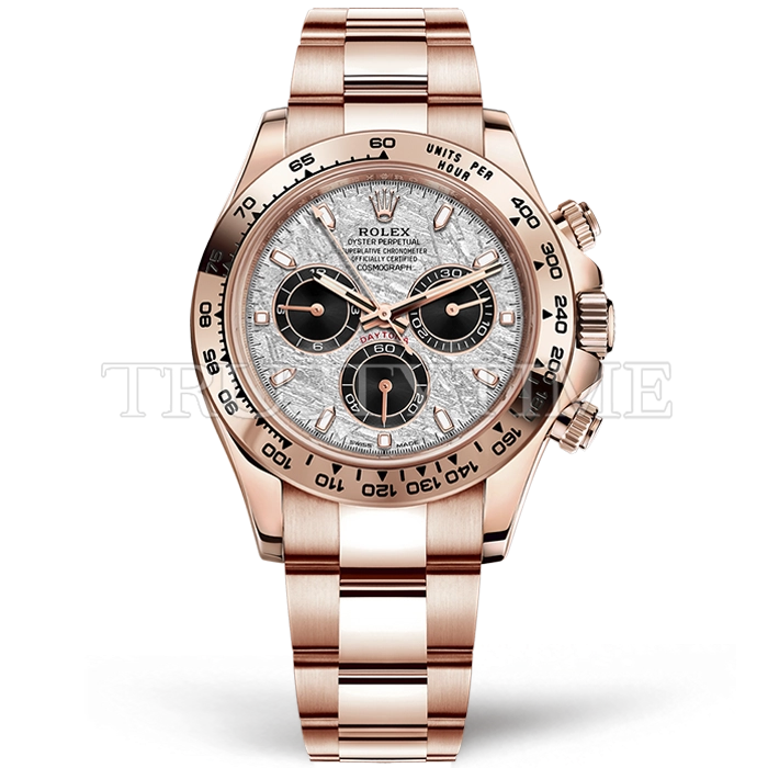 Часы Rolex из коллекции Daytona. Спортивные мужские часы Rolex Cosmograph Daytona 116505-0014 премиального качества (Артикул магазина: RX-2799) оснащены надежным автоматическим механизмом с автоподзаводом (работает от амплитуды движения руки) калибра 4130, в котором реализованы следующие функции: часовая, минутная и секундная стрелки, а так же хронограф. Круглый корпус часов розового цвета, имеющий размер 40 мм и высоту 12.5 мм превосходно дополнит образ и украсит запястье своего обладателя. Для изготовления часов Rolex Cosmograph Daytona 116505-0014 предлагаемых в нашем интернет-магазине, применяются нержавеющая сталь 904L высокого качества (Швейцарский стандарт), а так же сапфировое стекло высокой прочности, благодаря чему обеспечивается максимальная защита от сколов и механических повреждений. Отличительной чертой данной модели является серебристый циферблат, часовые индексы которого обеспечивают часовые метки. Завершает образ браслет из нержавеющей стали цвета розового золота с фирменной раскладывающейся застежкой Rolex. Водонепроницаемость данной модели составляет 100М (WR100) – в таких часах можно плавать и нырять без акваланга в морской и пресной воде, а также заниматься водными видами спорта.