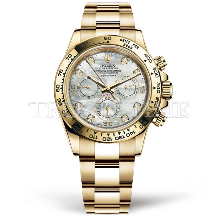 Часы Rolex из коллекции Daytona. Спортивные мужские часы Rolex Cosmograph Daytona 116508-0007 премиального качества (Артикул магазина: RX-2801) оснащены надежным автоматическим механизмом с автоподзаводом (работает от амплитуды движения руки) калибра 4130, в котором реализованы следующие функции: часовая, минутная и секундная стрелки, а так же хронограф. Круглый корпус часов цветы желтой золота, имеющий размер 40 мм и высоту 12.5 мм превосходно дополнит образ и украсит запястье своего обладателя. Для изготовления часов Rolex Cosmograph Daytona 116508-0007 предлагаемых в нашем интернет-магазине, применяются нержавеющая сталь 904L высокого качества (Швейцарский стандарт), а так же сапфировое стекло высокой прочности, благодаря чему обеспечивается максимальная защита от сколов и механических повреждений. Отличительной чертой данной модели является перламутровый циферблат, часовые индексы которого обеспечивают камни. Завершает образ браслет из нержавеющей стали цвета желтого золота с фирменной раскладывающейся застежкой Rolex. Водонепроницаемость данной модели составляет 100М (WR100) – в таких часах можно плавать и нырять без акваланга в морской и пресной воде, а также заниматься водными видами спорта.