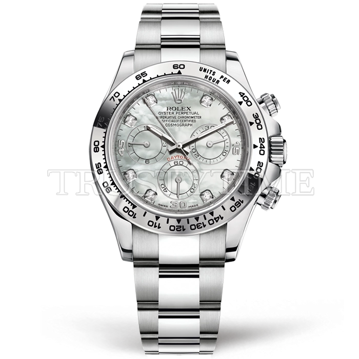 Часы Rolex из коллекции Daytona. Спортивные мужские часы Rolex Cosmograph Daytona 116509-0064 премиального качества (Артикул магазина: RX-2804) оснащены надежным автоматическим механизмом с автоподзаводом (работает от амплитуды движения руки) калибра 4130, в котором реализованы следующие функции: часовая, минутная и секундная стрелки, а так же хронограф. Круглый корпус часов стального цвета, имеющий размер 40 мм и высоту 12.5 мм превосходно дополнит образ и украсит запястье своего обладателя. Для изготовления часов Rolex Cosmograph Daytona 116509-0064 предлагаемых в нашем интернет-магазине, применяются нержавеющая сталь 904L высокого качества (Швейцарский стандарт), а так же сапфировое стекло высокой прочности, благодаря чему обеспечивается максимальная защита от сколов и механических повреждений. Отличительной чертой данной модели является перламутровый циферблат, часовые индексы которого обеспечивают камни. Завершает образ браслет из нержавеющей стали стального цвета с фирменной раскладывающейся застежкой Rolex. Водонепроницаемость данной модели составляет 100М (WR100) – в таких часах можно плавать и нырять без акваланга в морской и пресной воде, а также заниматься водными видами спорта.