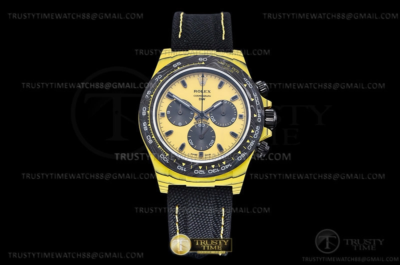 Часы Rolex из коллекции Daytona DIW. Спортивные мужские часы Rolex Cosmograph Daytona DIW Bumblebee премиального качества (Артикул магазина: RX-2908) оснащены надежным автоматическим механизмом с автоподзаводом (работает от амплитуды движения руки) калибра 4130, в котором реализованы следующие функции: часовая, минутная и секундная стрелки, а так же хронограф. Круглый корпус часов желтого цвета, имеющий размер 40 мм и высоту 12.5 мм превосходно дополнит образ и украсит запястье своего обладателя. Для изготовления часов Rolex Cosmograph Daytona DIW Bumblebee предлагаемых в нашем интернет-магазине, применяются кованый карбон высокого качества (Швейцарский стандарт), а так же сапфировое стекло высокой прочности, благодаря чему обеспечивается максимальная защита от сколов и механических повреждений. Отличительной чертой данной модели является желтый циферблат, часовые индексы которого обеспечивают часовые метки. Завершает образ нейлоновый ремешок черного цвета на липучке Rolex. Водонепроницаемость данной модели составляет 30М (WR30) – допускается минимальное воздействие с водой.