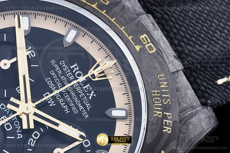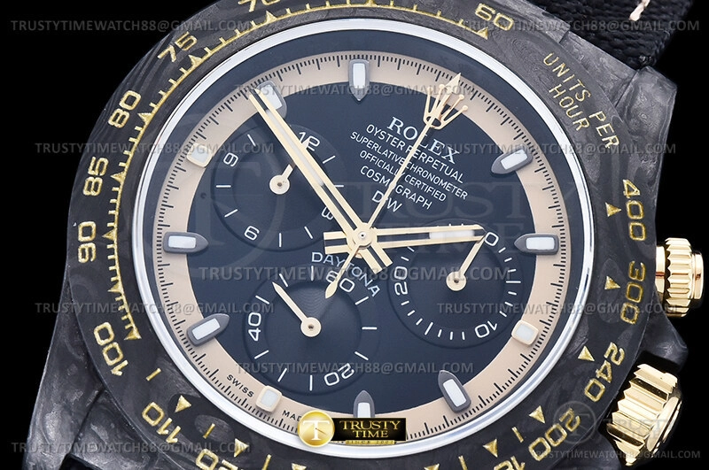 Часы Rolex из коллекции Daytona DIW. Спортивные мужские часы Rolex Cosmograph Daytona DIW Cream Invert Gold премиального качества (Артикул магазина: RX-2909) оснащены надежным автоматическим механизмом с автоподзаводом (работает от амплитуды движения руки) калибра Valjoux-7750, в котором реализованы следующие функции: часовая, минутная и секундная стрелки, а так же хронограф. Круглый корпус часов черного цвета, имеющий размер 40 мм и высоту 13 мм превосходно дополнит образ и украсит запястье своего обладателя. Для изготовления часов Rolex Cosmograph Daytona DIW Cream Invert Gold предлагаемых в нашем интернет-магазине, применяются кованый карбон высокого качества (Швейцарский стандарт), а так же сапфировое стекло высокой прочности, благодаря чему обеспечивается максимальная защита от сколов и механических повреждений. Отличительной чертой данной модели является черный циферблат, часовые индексы которого обеспечивают часовые метки. Завершает образ нейлоновый ремешок черного цвета на липучке Rolex. Водонепроницаемость данной модели составляет 30М (WR30) – допускается минимальное воздействие с водой.