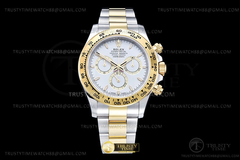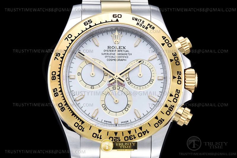 Часы Rolex из коллекции Daytona. Спортивные мужские часы Rolex Cosmograph Daytona 126503-0001 премиального качества (Артикул магазина: RX-3412) оснащены надежным автоматическим механизмом с автоподзаводом (работает от амплитуды движения руки) калибра 4131, в котором реализованы следующие функции: часовая, минутная и секундная стрелки, а так же хронограф. Круглый корпус часов комбинированного сталь с желтого золота цвета, имеющий размер 40 мм и высоту 12 мм превосходно дополнит образ и украсит запястье своего обладателя. Для изготовления часов Rolex Cosmograph Daytona 126503-0001 предлагаемых в нашем интернет-магазине, применяются нержавеющая сталь 904L высокого качества (Швейцарский стандарт), а так же сапфировое стекло высокой прочности, благодаря чему обеспечивается максимальная защита от сколов и механических повреждений. Отличительной чертой данной модели является белый циферблат, часовые индексы которого обеспечивают часовые метки. Завершает образ браслет из нержавеющей стали комбинированного сталь с желтым золотом цвета с фирменной раскладывающейся застежкой Rolex. Водонепроницаемость данной модели составляет 100М (WR100) – в таких часах можно плавать и нырять без акваланга в морской и пресной воде, а также заниматься водными видами спорта.