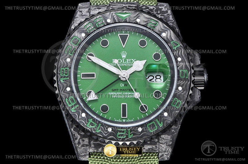 Часы Rolex из коллекции GMT Master II DIW. Спортивные мужские часы Rolex GMT Master II DIW Desert Camo премиального качества (Артикул магазина: RX-2034) оснащены надежным автоматическим механизмом с автоподзаводом (работает от амплитуды движения руки) калибра 3186, в котором реализованы следующие функции: часовая, минутная и секундная стрелки, а так же дата, двойное время (GMT). Круглый корпус часов черного цвета, имеющий размер 40 мм и высоту 12 мм превосходно дополнит образ и украсит запястье своего обладателя. Для изготовления часов Rolex GMT Master II DIW Desert Camo предлагаемых в нашем интернет-магазине, применяются кованый карбон высокого качества (Швейцарский стандарт), а так же сапфировое стекло высокой прочности, благодаря чему обеспечивается максимальная защита от сколов и механических повреждений. Отличительной чертой данной модели является зеленый циферблат, часовые индексы которого обеспечивают часовые метки. Завершает образ нейлоновый ремешок зеленого цвета на липучке Rolex. Водонепроницаемость данной модели составляет 30М (WR30) – допускается минимальное воздействие с водой.