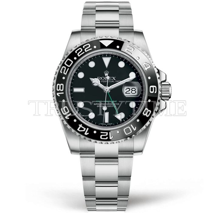 Часы Rolex из коллекции GMT Master II. Классические мужские часы Rolex GMT Master II 116710LN-0001 премиального качества (Артикул магазина: RX-2235) оснащены надежным автоматическим механизмом с автоподзаводом (работает от амплитуды движения руки) калибра 3186, в котором реализованы следующие функции: часовая, минутная и секундная стрелки, а так же дата, двойное время (GMT). Круглый корпус часов стального цвета, имеющий размер 40 мм и высоту 12.1 мм превосходно дополнит образ и украсит запястье своего обладателя. Для изготовления часов Rolex GMT Master II 116710LN-0001 предлагаемых в нашем интернет-магазине, применяются нержавеющая сталь 904L высокого качества (Швейцарский стандарт), а так же сапфировое стекло высокой прочности, благодаря чему обеспечивается максимальная защита от сколов и механических повреждений. Отличительной чертой данной модели является черный циферблат, часовые индексы которого обеспечивают часовые метки. Завершает образ браслет из нержавеющей стали стального цвета с фирменной раскладывающейся застежкой Rolex. Водонепроницаемость данной модели составляет 30М (WR30) – допускается минимальное воздействие с водой.