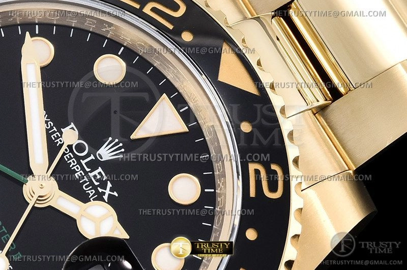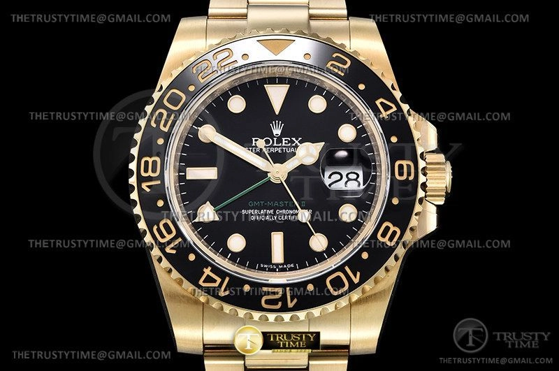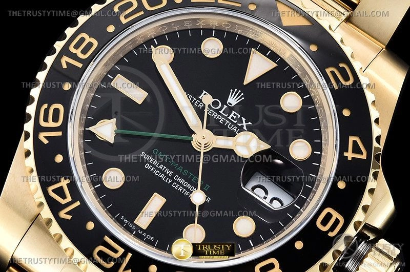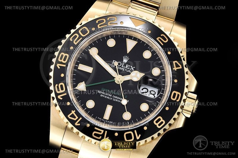 Часы Rolex из коллекции GMT Master II. Классические мужские часы Rolex GMT Master II 116718LN-0001 премиального качества (Артикул магазина: RX-2240) оснащены надежным автоматическим механизмом с автоподзаводом (работает от амплитуды движения руки) калибра 3186, в котором реализованы следующие функции: часовая, минутная и секундная стрелки, а так же дата, двойное время (GMT). Круглый корпус часов цветы желтой золота, имеющий размер 40 мм и высоту 12.1 мм превосходно дополнит образ и украсит запястье своего обладателя. Для изготовления часов Rolex GMT Master II 116718LN-0001 предлагаемых в нашем интернет-магазине, применяются нержавеющая сталь 904L высокого качества (Швейцарский стандарт), а так же сапфировое стекло высокой прочности, благодаря чему обеспечивается максимальная защита от сколов и механических повреждений. Отличительной чертой данной модели является черный циферблат, часовые индексы которого обеспечивают часовые метки. Завершает образ браслет из нержавеющей стали цвета желтого золота с фирменной раскладывающейся застежкой Rolex. Водонепроницаемость данной модели составляет 30М (WR30) – допускается минимальное воздействие с водой.