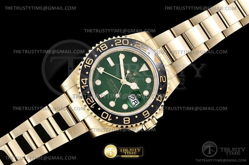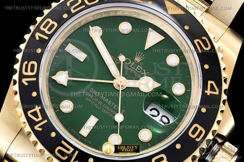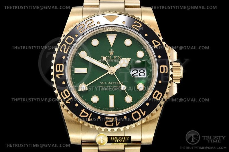 Часы Rolex из коллекции GMT Master II. Классические мужские часы Rolex GMT Master II 116718LN-0002 премиального качества (Артикул магазина: RX-2241) оснащены надежным автоматическим механизмом с автоподзаводом (работает от амплитуды движения руки) калибра 3186, в котором реализованы следующие функции: часовая, минутная и секундная стрелки, а так же дата, двойное время (GMT). Круглый корпус часов цветы желтой золота, имеющий размер 40 мм и высоту 12.1 мм превосходно дополнит образ и украсит запястье своего обладателя. Для изготовления часов Rolex GMT Master II 116718LN-0002 предлагаемых в нашем интернет-магазине, применяются нержавеющая сталь 904L высокого качества (Швейцарский стандарт), а так же сапфировое стекло высокой прочности, благодаря чему обеспечивается максимальная защита от сколов и механических повреждений. Отличительной чертой данной модели является зеленый циферблат, часовые индексы которого обеспечивают часовые метки. Завершает образ браслет из нержавеющей стали цвета желтого золота с фирменной раскладывающейся застежкой Rolex. Водонепроницаемость данной модели составляет 30М (WR30) – допускается минимальное воздействие с водой.