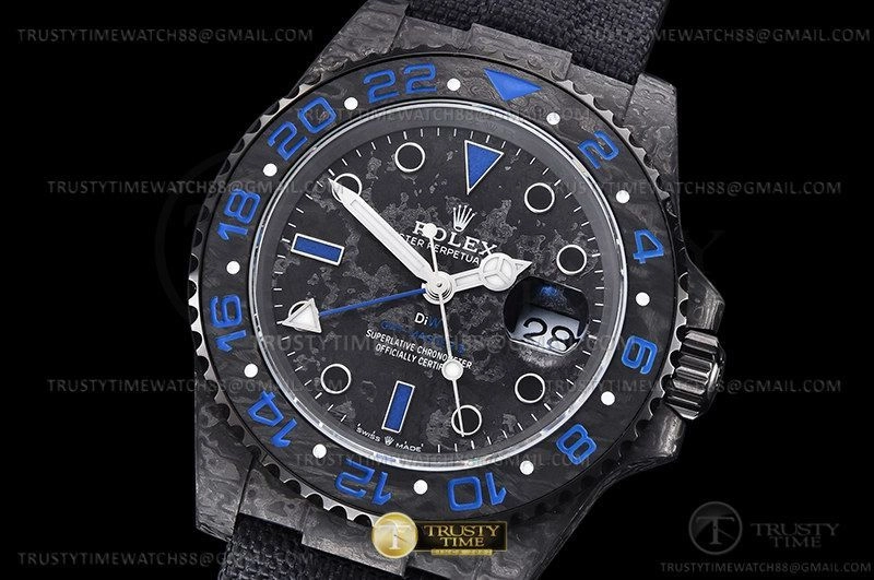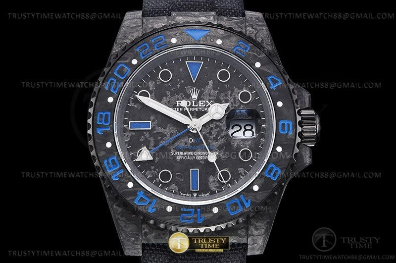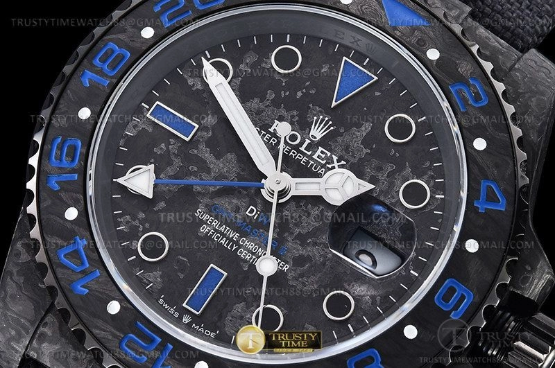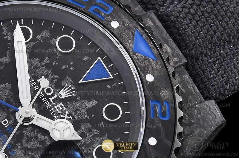 Часы Rolex из коллекции GMT Master II DIW. Спортивные мужские часы Rolex GMT Master II DIW Electro премиального качества (Артикул магазина: RX-2407) оснащены надежным автоматическим механизмом с автоподзаводом (работает от амплитуды движения руки) калибра 3186, в котором реализованы следующие функции: часовая, минутная и секундная стрелки, а так же дата, двойное время (GMT). Круглый корпус часов черного цвета, имеющий размер 40 мм и высоту 12 мм превосходно дополнит образ и украсит запястье своего обладателя. Для изготовления часов Rolex GMT Master II DIW Electro предлагаемых в нашем интернет-магазине, применяются кованый карбон высокого качества (Швейцарский стандарт), а так же сапфировое стекло высокой прочности, благодаря чему обеспечивается максимальная защита от сколов и механических повреждений. Отличительной чертой данной модели является черный циферблат, часовые индексы которого обеспечивают часовые метки. Завершает образ нейлоновый ремешок черного цвета на липучке Rolex. Водонепроницаемость данной модели составляет 30М (WR30) – допускается минимальное воздействие с водой.