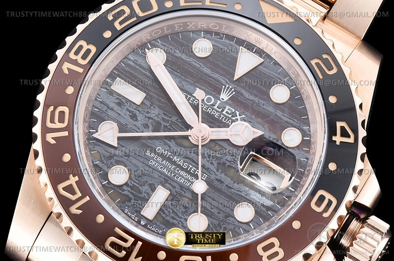 Часы Rolex из коллекции GMT Master II. Классические мужские часы Rolex GMT Master II 40mm 126715CHNR-0002 премиального качества (Артикул магазина: RX-3535) оснащены надежным автоматическим механизмом с автоподзаводом (работает от амплитуды движения руки) калибра 3285, в котором реализованы следующие функции: часовая, минутная и секундная стрелки, а так же дата, двойное время (GMT). Круглый корпус часов розового цвета, имеющий размер 40 мм и высоту 12 мм превосходно дополнит образ и украсит запястье своего обладателя. Для изготовления часов Rolex GMT Master II 40mm 126715CHNR-0002 предлагаемых в нашем интернет-магазине, применяются нержавеющая сталь 904L высокого качества (Швейцарский стандарт), а так же сапфировое стекло высокой прочности, благодаря чему обеспечивается максимальная защита от сколов и механических повреждений. Отличительной чертой данной модели является коричневый циферблат, часовые индексы которого обеспечивают часовые метки. Завершает образ браслет из нержавеющей стали цвета розового золота с фирменной раскладывающейся застежкой Rolex. Водонепроницаемость данной модели составляет 30М (WR30) – допускается минимальное воздействие с водой.
