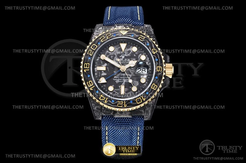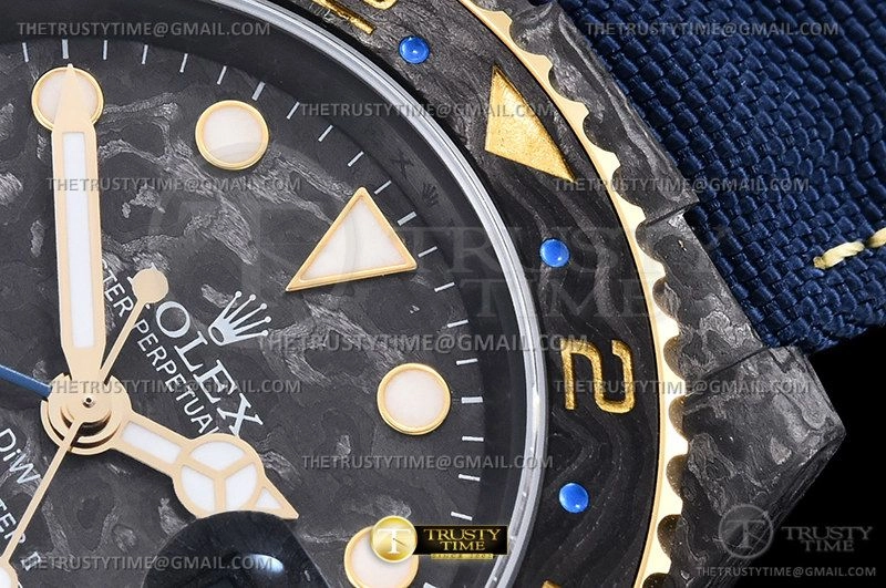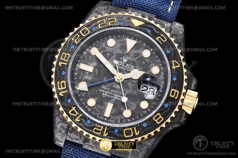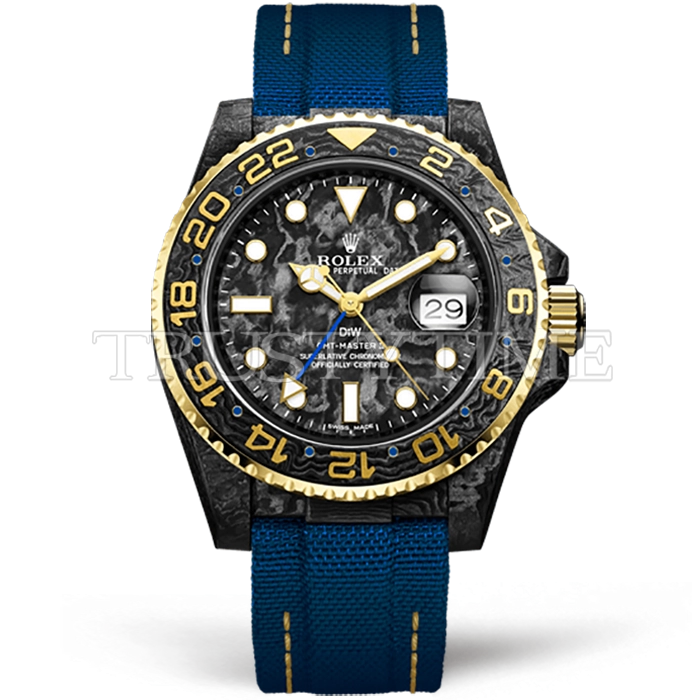 Часы Rolex из коллекции GMT Master II DIW. Спортивные мужские часы Rolex GMT Master II DIW Electro премиального качества (Артикул магазина: RX-2173) оснащены надежным автоматическим механизмом с автоподзаводом (работает от амплитуды движения руки) калибра 3186, в котором реализованы следующие функции: часовая, минутная и секундная стрелки, а так же дата, двойное время (GMT). Круглый корпус часов черного цвета, имеющий размер 40 мм и высоту 12 мм превосходно дополнит образ и украсит запястье своего обладателя. Для изготовления часов Rolex GMT Master II DIW Electro предлагаемых в нашем интернет-магазине, применяются кованый карбон высокого качества (Швейцарский стандарт), а так же сапфировое стекло высокой прочности, благодаря чему обеспечивается максимальная защита от сколов и механических повреждений. Отличительной чертой данной модели является черный циферблат, часовые индексы которого обеспечивают часовые метки. Завершает образ нейлоновый ремешок синего цвета на липучке Rolex. Водонепроницаемость данной модели составляет 30М (WR30) – допускается минимальное воздействие с водой.